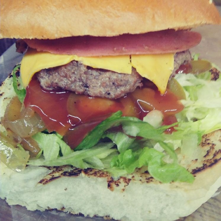 Pan artesanal, carne 100% de res, queso amarillo, jamón, piña, cebolla asada,tomate, chiles curtidos, lechuga y aderezos.