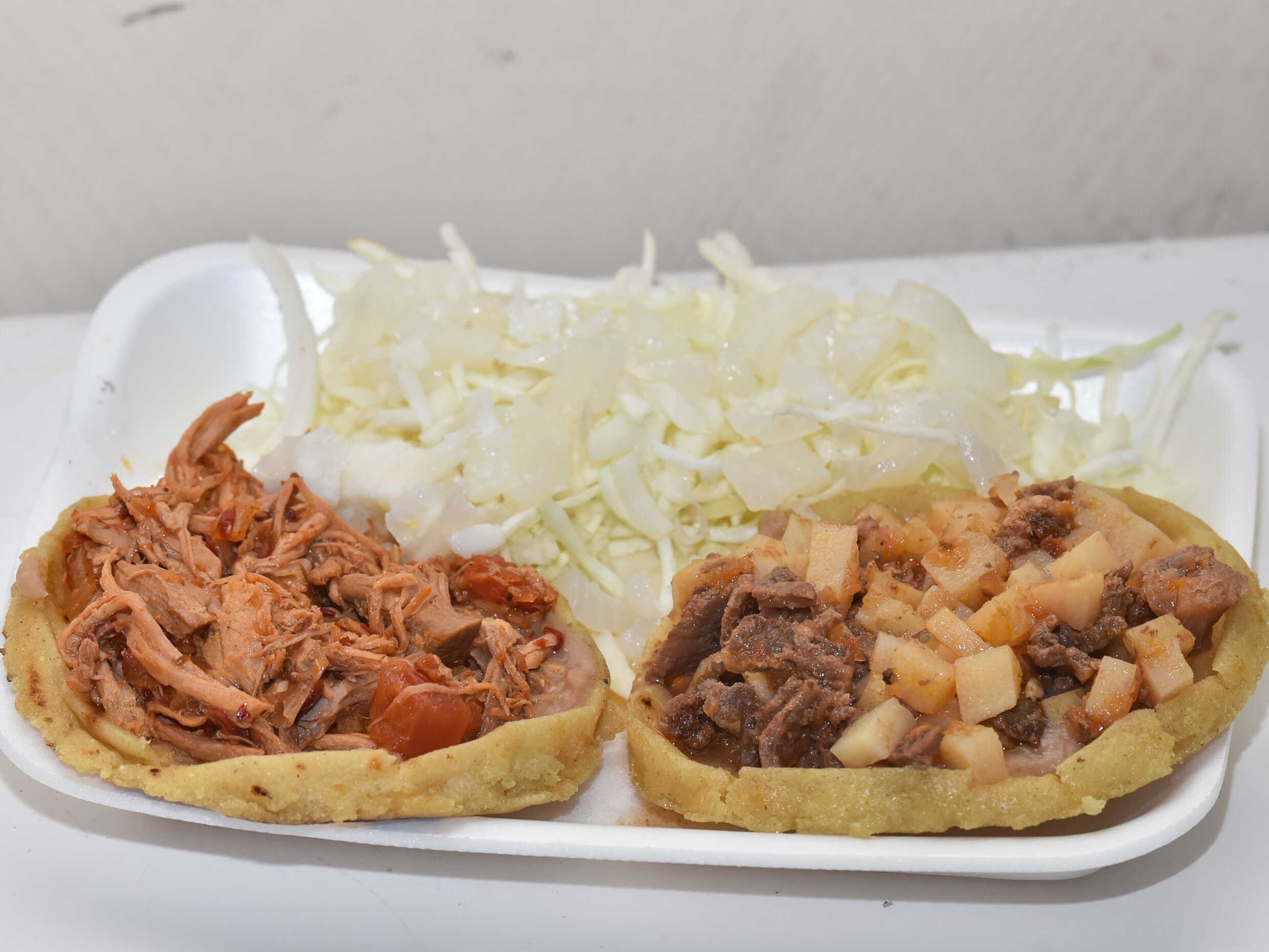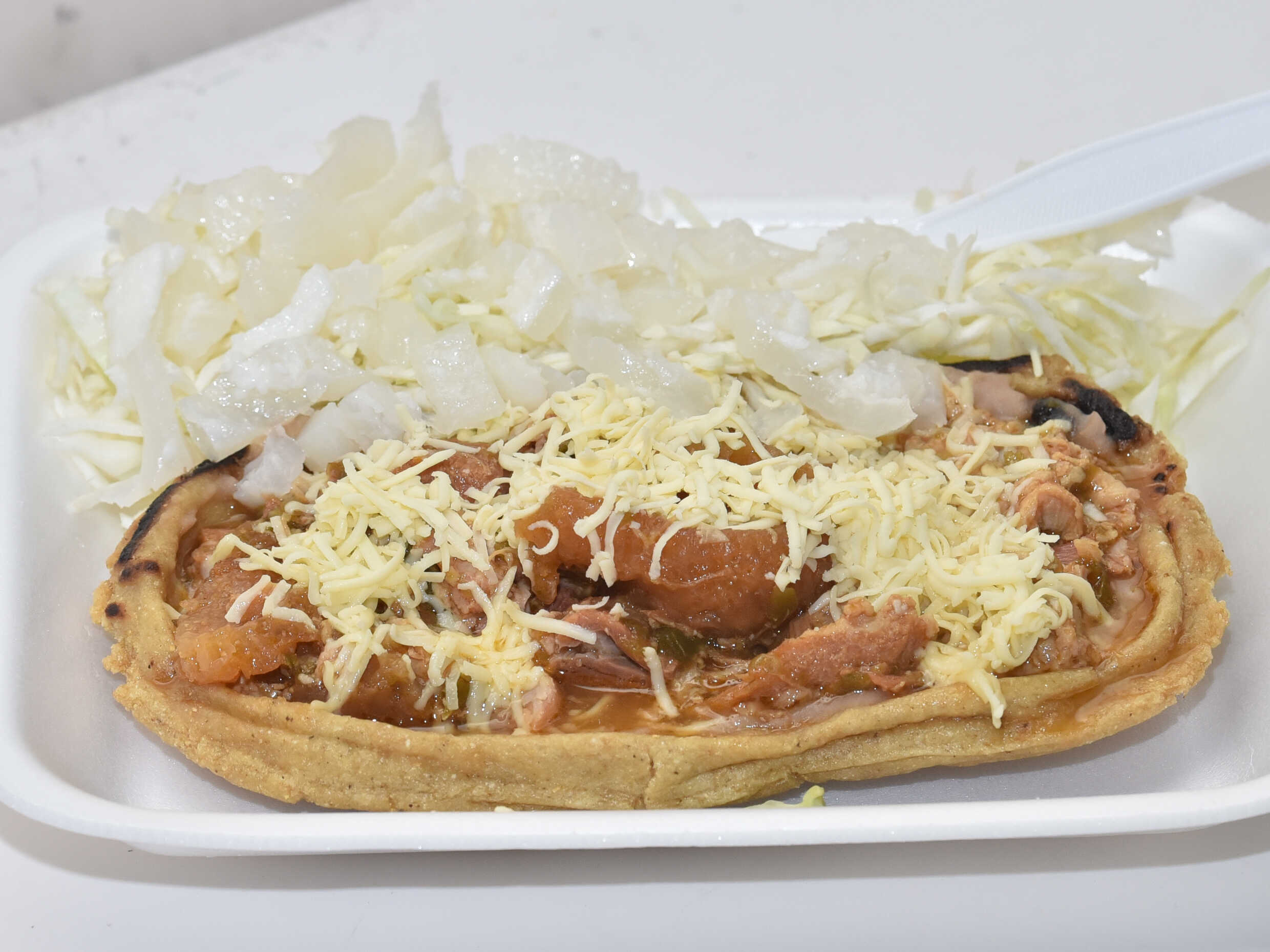 Gordita de maíz frita rellena de guisos mexicanos con salsa, repollo, cueritos (complementos a parte)