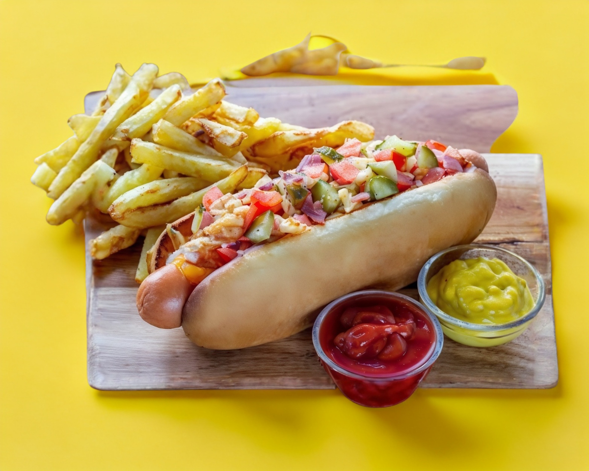 Pan Artesanal, Salchicha Para asar, Tocino, Queso amarillo, y doble snack