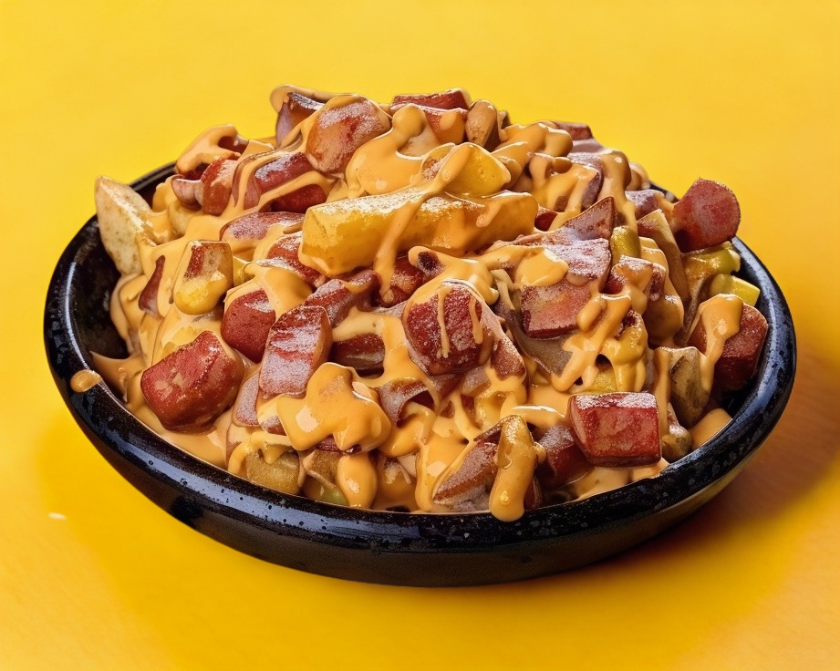 Nuestras crujientes papas fritas con salchicha,tocino, queso derretido, crema.