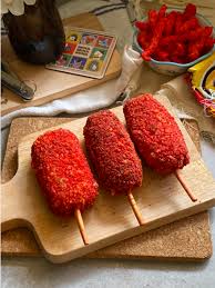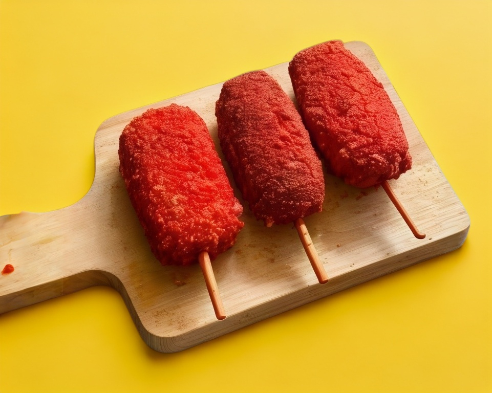 Salchicha pavo Jumbo previamente cubierto por nuestra crujiente masa especial, espolvoreada por Snak a elegir Flamin hot.