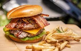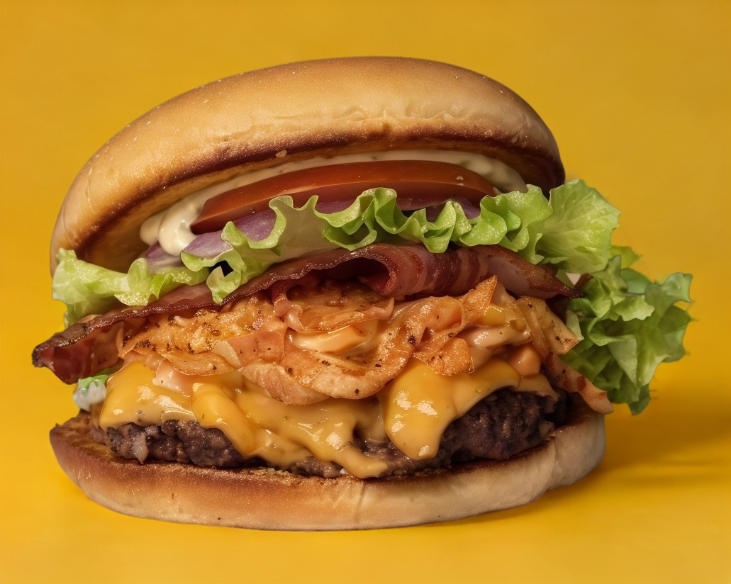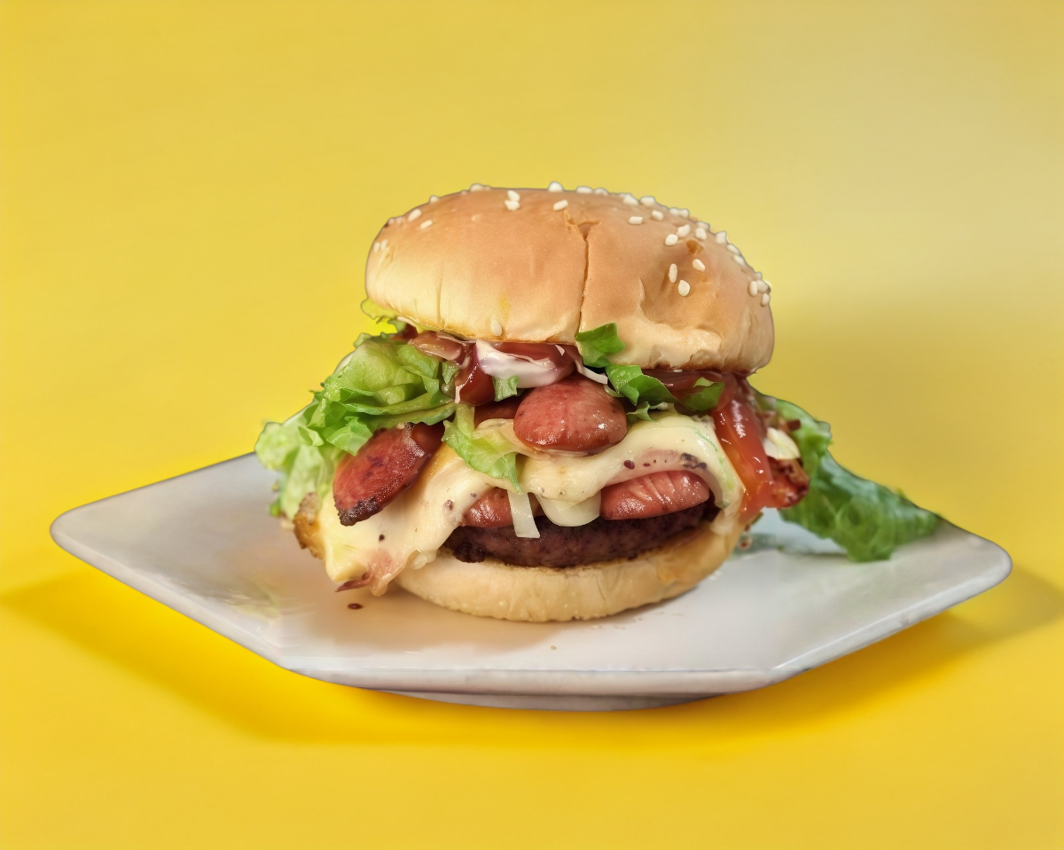 Pan de artesanal, Triple Carne de res, Triple Queso amarillo, Doble porción de Tocino y Doble porción de Salchicha p/asar, Tomate. Cebolla, Lechuga y Aderezos.