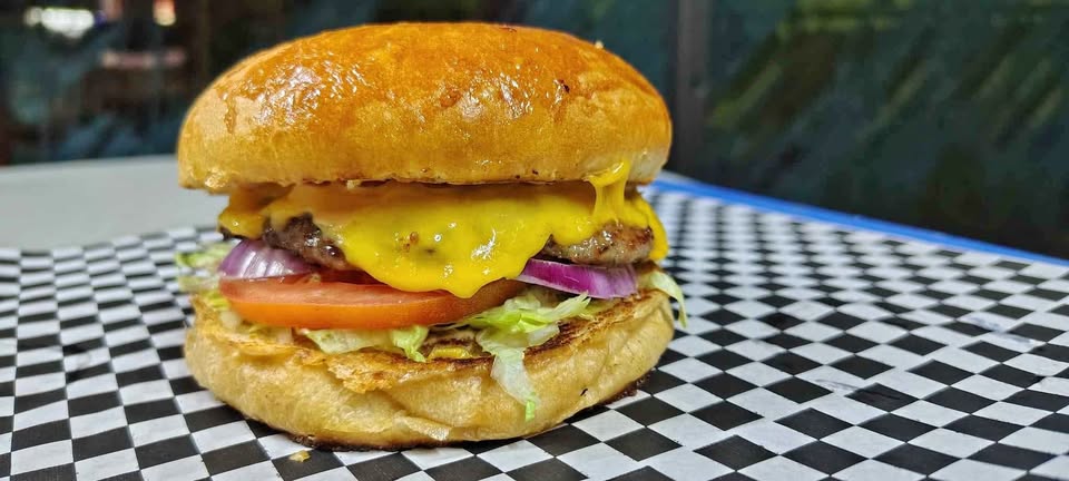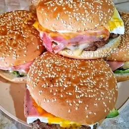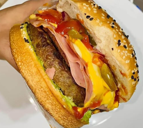 Doble, carne doble, jamón doble queso amarillo, salchicha para asar y tocino.
