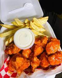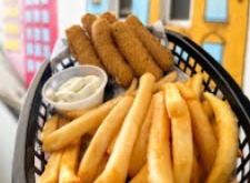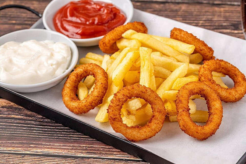 200 grms Papas Fritas, 200 grms Boneless, 150 grms Dedos de Queso , 150 grms Aros de Cebolla