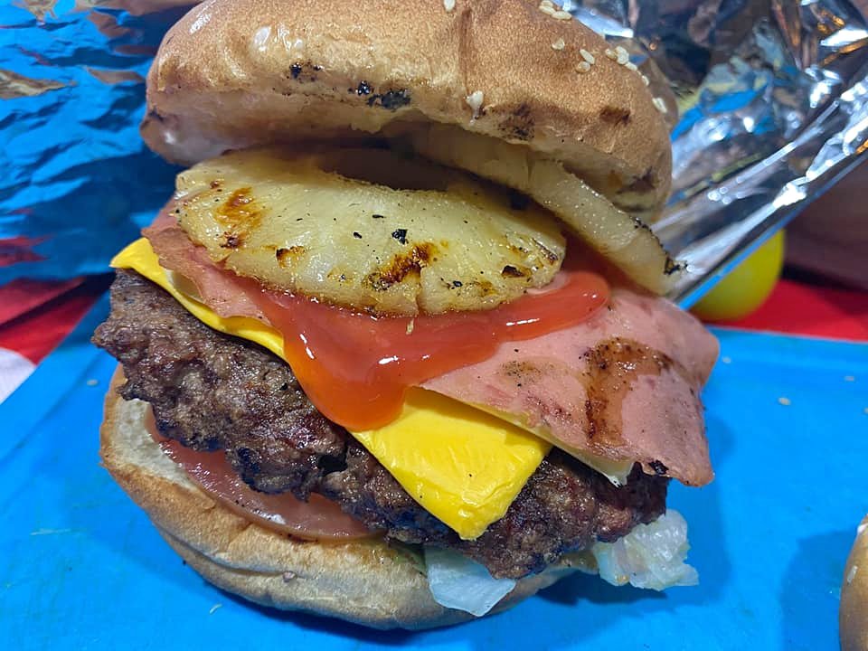 sentada en lechuga carne queso jamon tocino piña y aros de cebolla