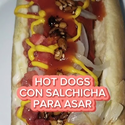salchicha para asar, cebolla cocida, tomate y aderezos