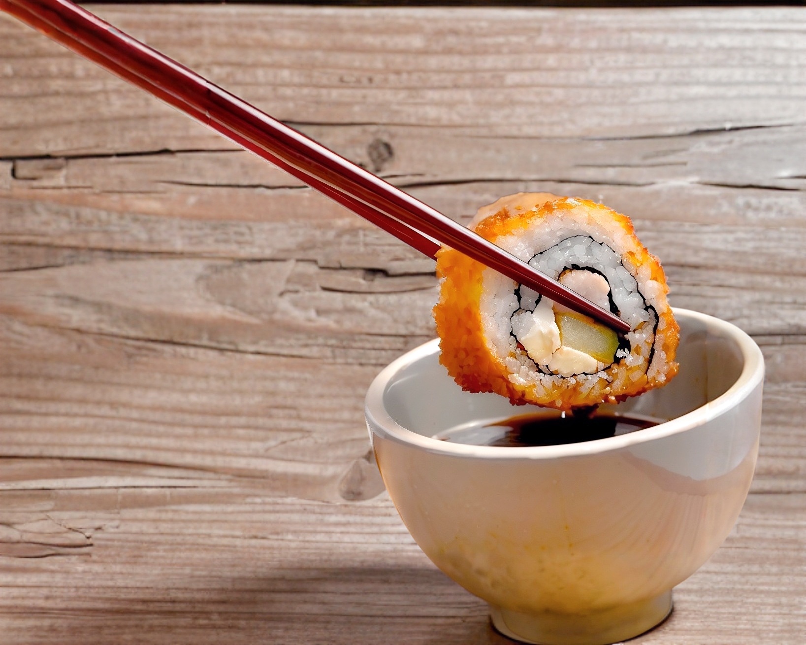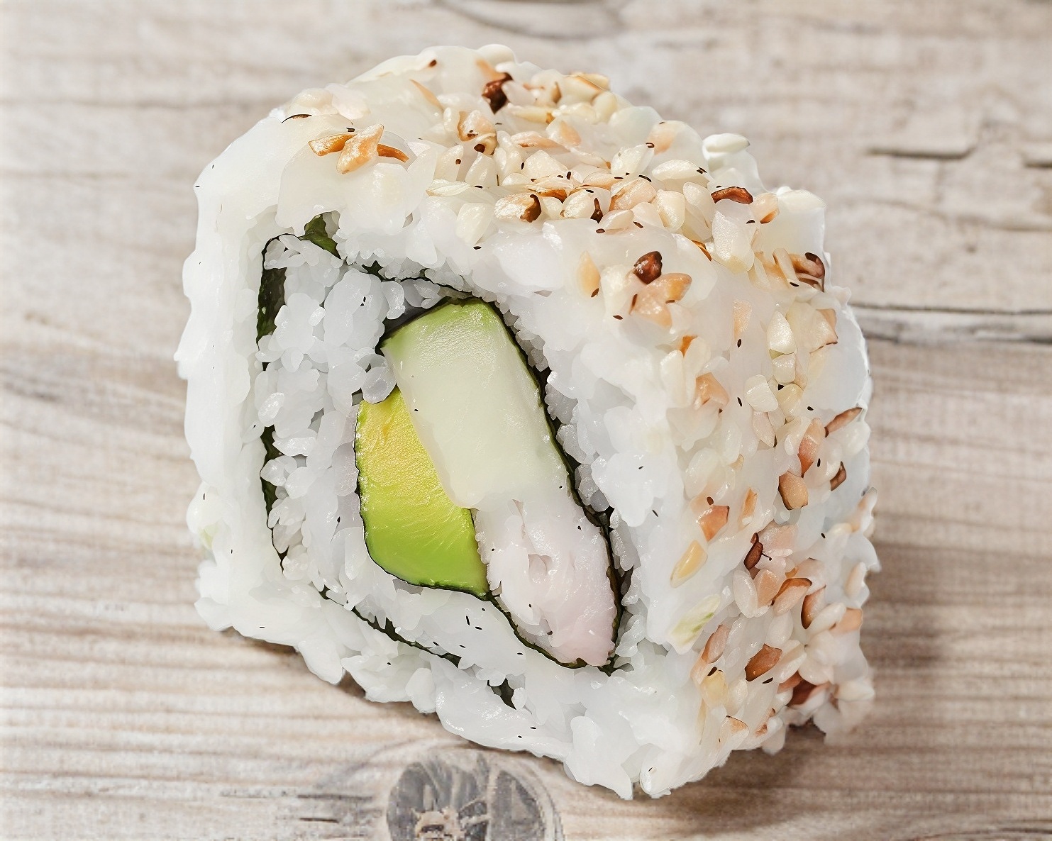 Delicioso rollo empanizado con panko, relleno de camarones, queso crema y aguacate.