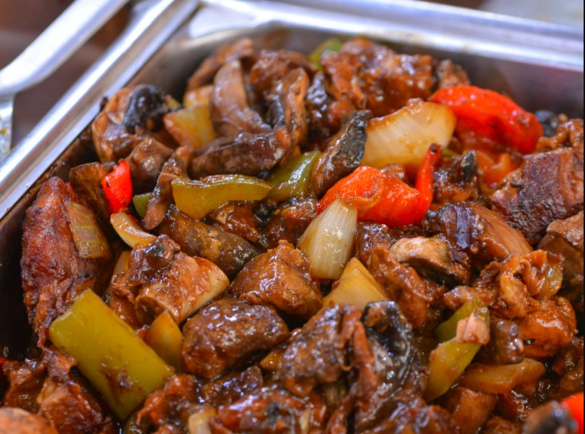 2 Guisos de pollo agridulce o acaramelado y arroz o pasta o combinado (arroz y pasta).