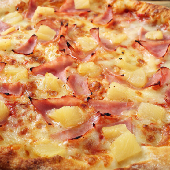 PIZZA HAWAIANA trae 8 porciones , cubierto con salsa de tomate y queso mozarella , con piña y jamon