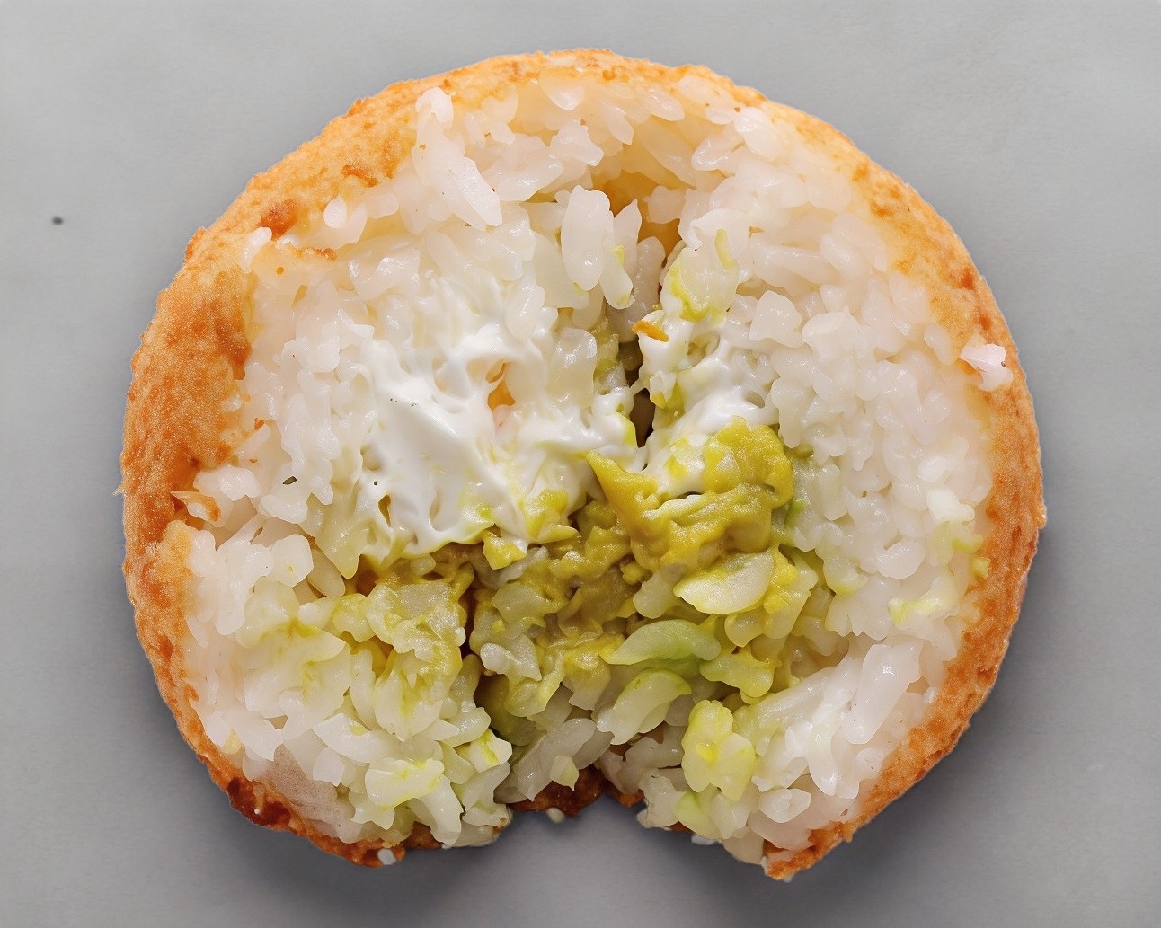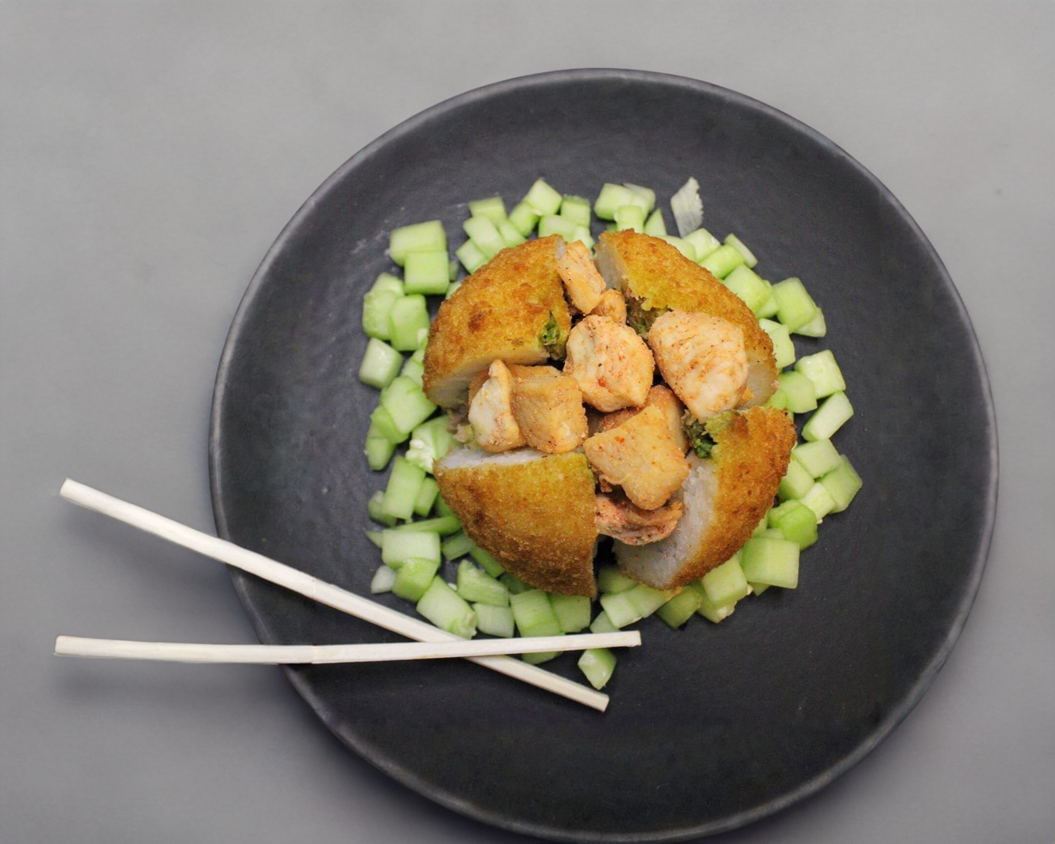 Bola de arroz rellena de queso crema, pasta tampico y aguacate. Con pollo y bañada en salsa chipotle y anguila. Acompañada de pepino y ajonjolí negro.