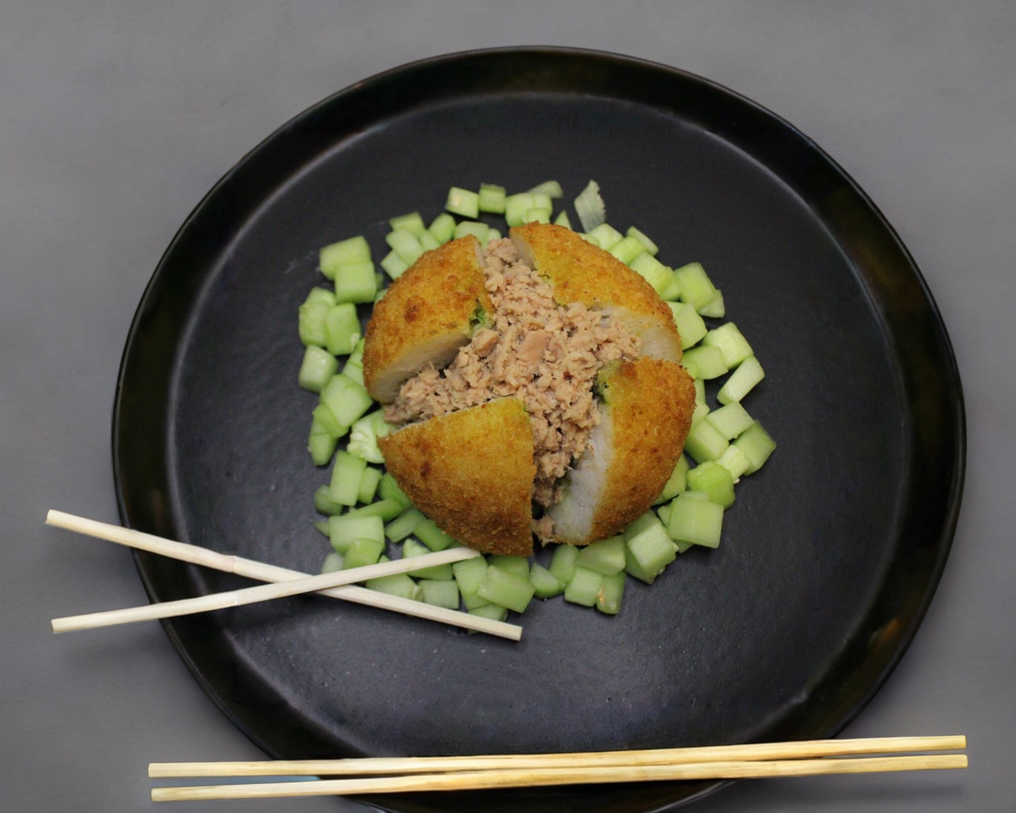 Bola de arroz rellena de queso crema, pasta tampico, y aguacate. Con atun y banada en salsa chipotle y anguila. Acompanada de pepino y ajonjoli negro.