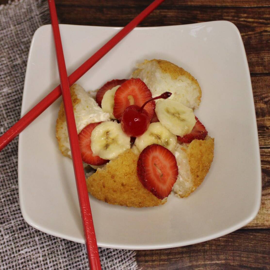 Bola de arroz rellena de queso crema y mermelada de fresa. Acompañada de plátano, fresa, nuez y cereza, y bañada con lechera y chocolate hershey's.