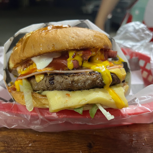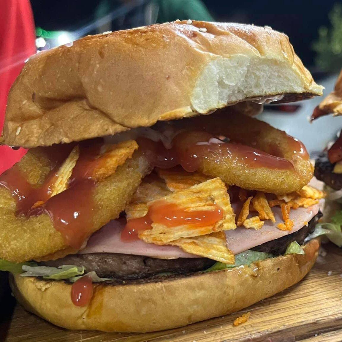 CARNE DE RES, JAMON, QUESO AMARILLO, TOCINO, AROS DE CEBOLLA, RUFLES.