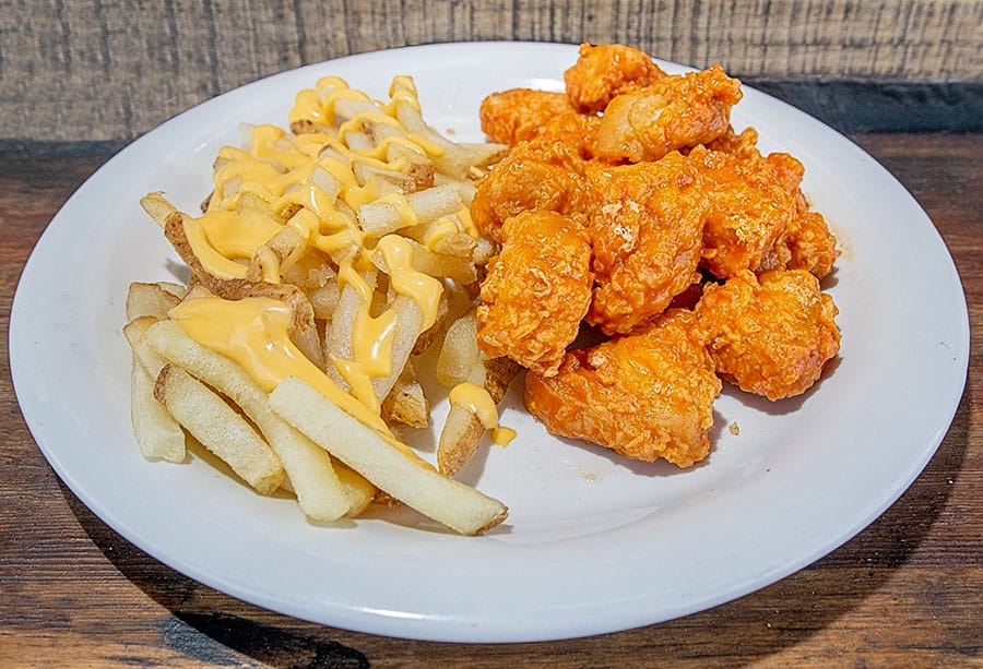 Papas fritas con 6 boneless acompañados de trocitos de salchicha asada, elige tu salsa y aderezo favorito.