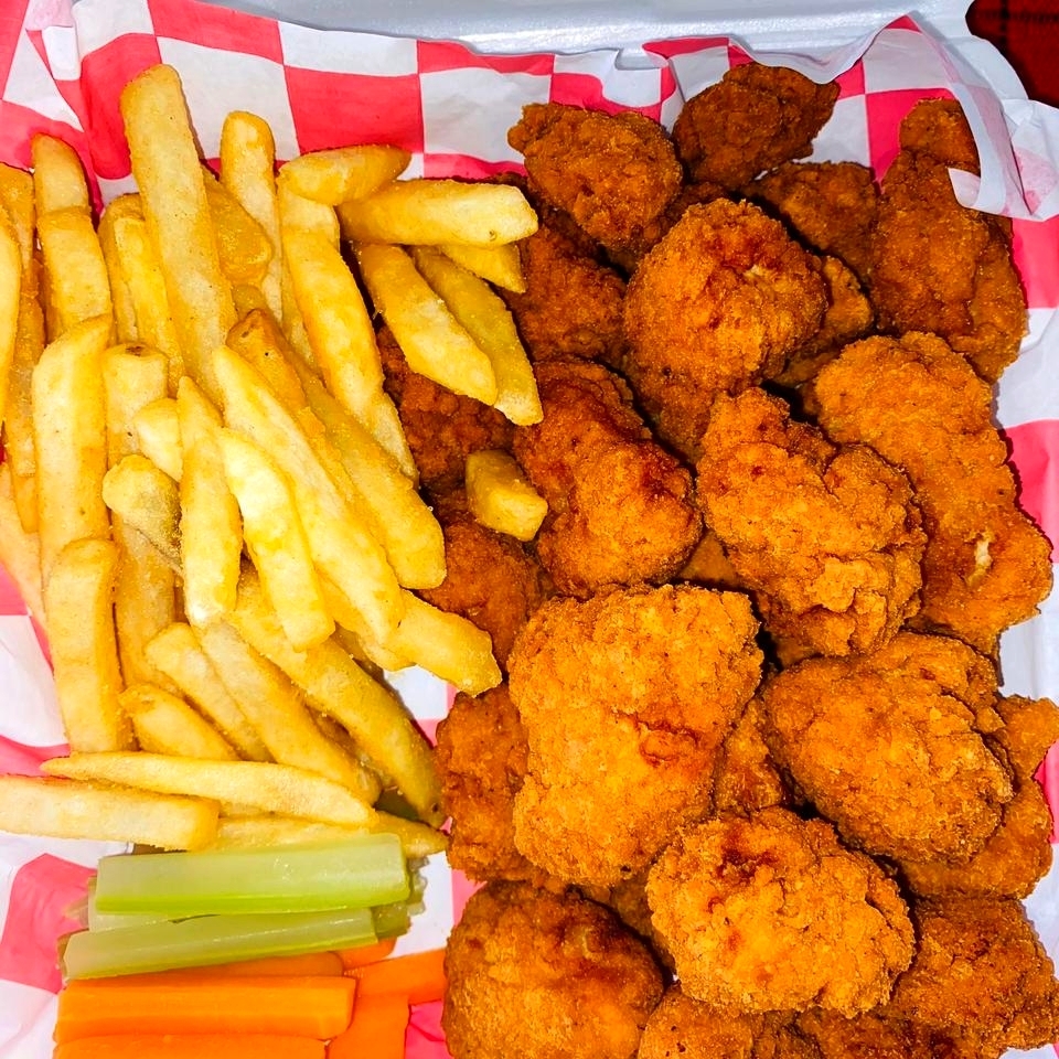 Boneless naturales o bañados acompañados de una porción de papas a la francesa.