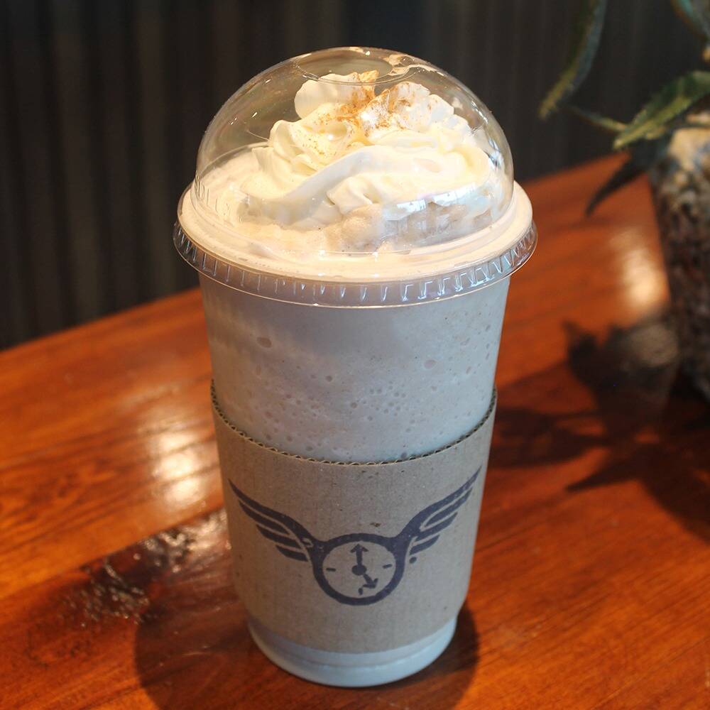 Frappé con té, especias y hierbas aromáticas a base de leche.