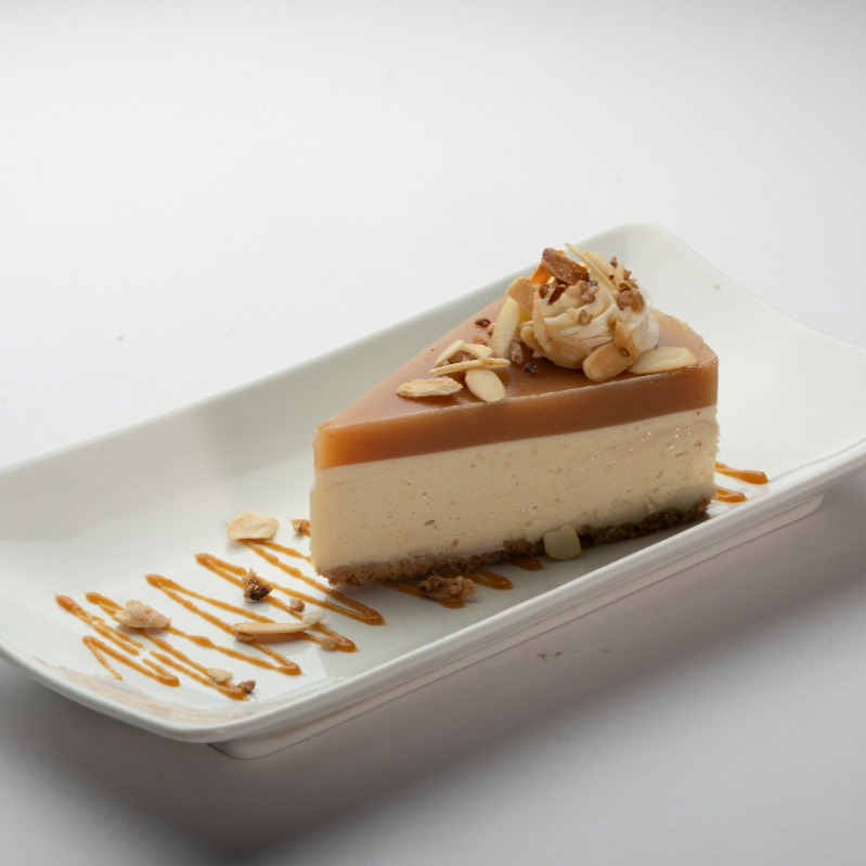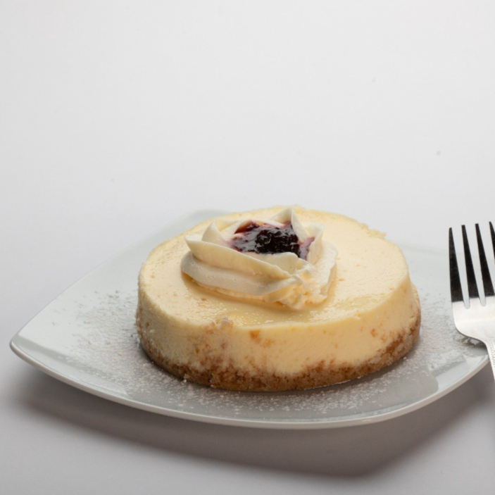 Cremoso cheesecake con una base de galleta, el equilibrio perfecto entre dulzura y acidez.