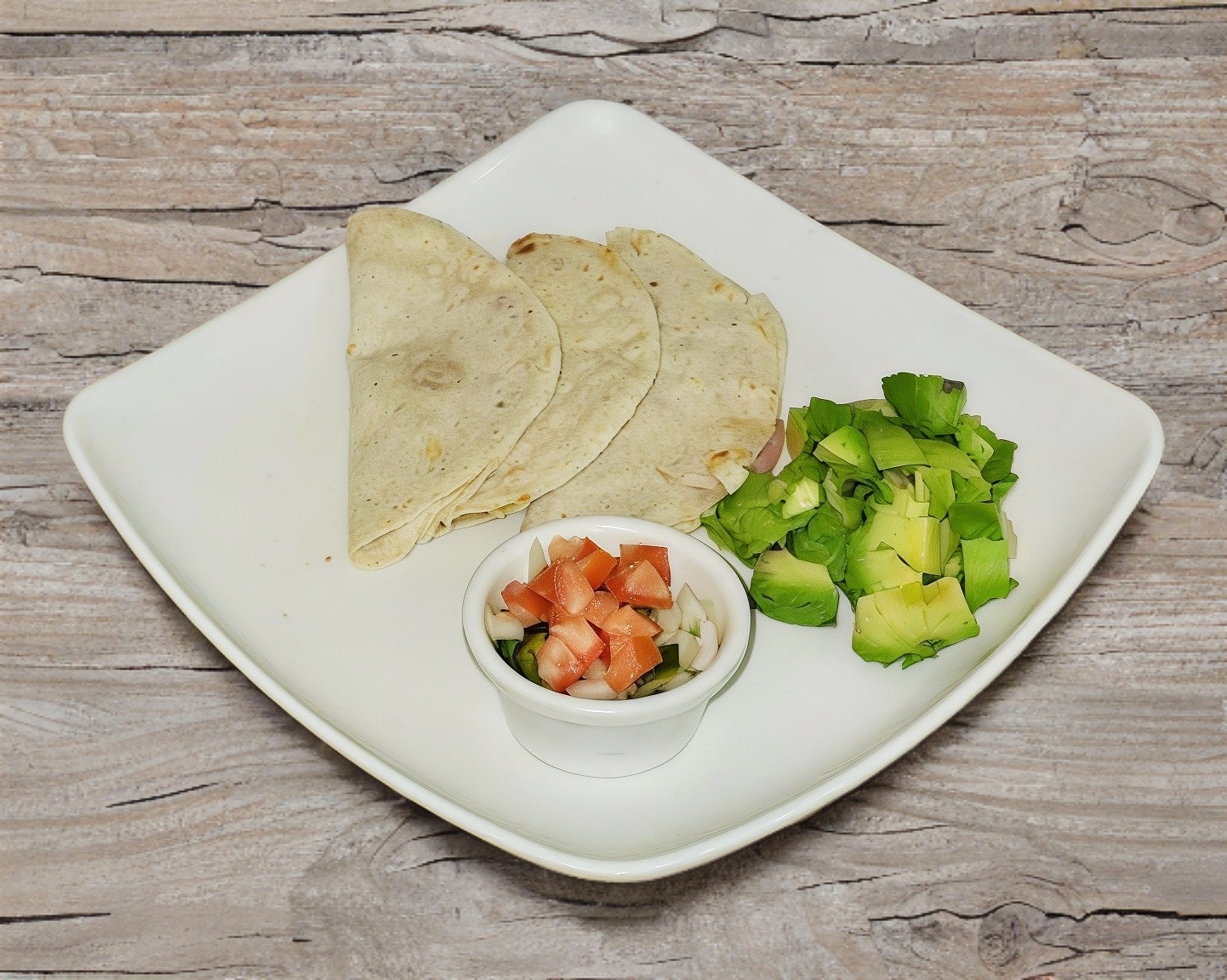 3 piezas, tortilla de harina con queso a elegir (chihuahua o panela) y jamón de pavo, acompañado de pico de gallo y aguacate.