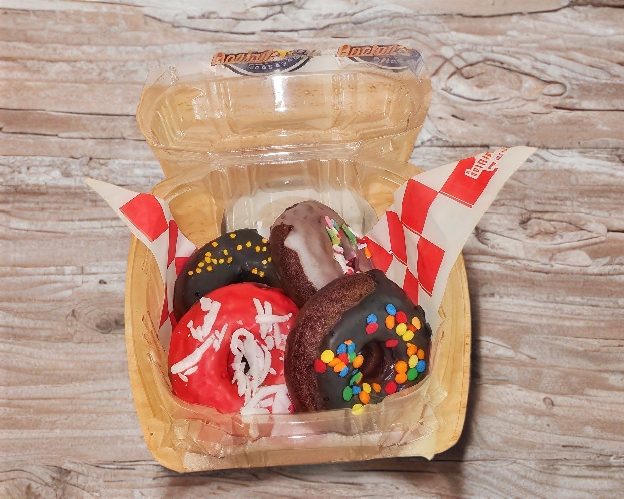 Domo con 4 minidonas horneadas (masa chocolate/naranja, vainilla), glaseadas y con toppings diversos.