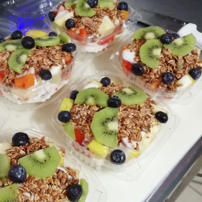Mezcla de Manzana, Piña y Papaya. Decorado con Kiwi, Yoghurt, Granola y Miel de Abeja