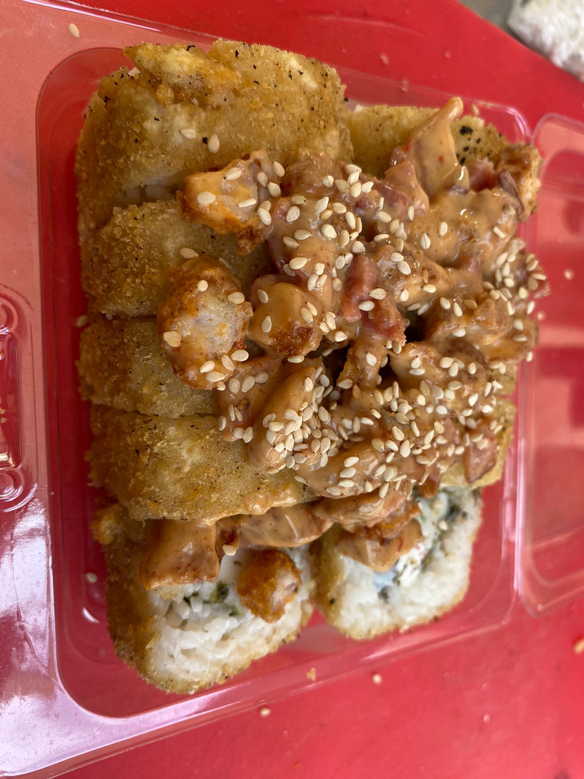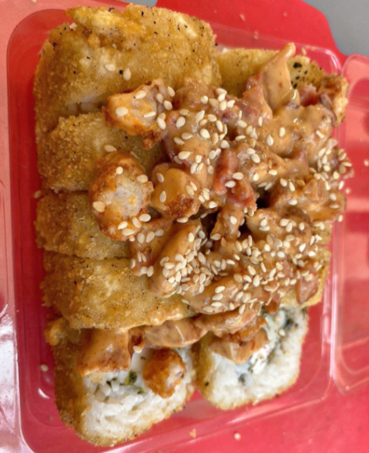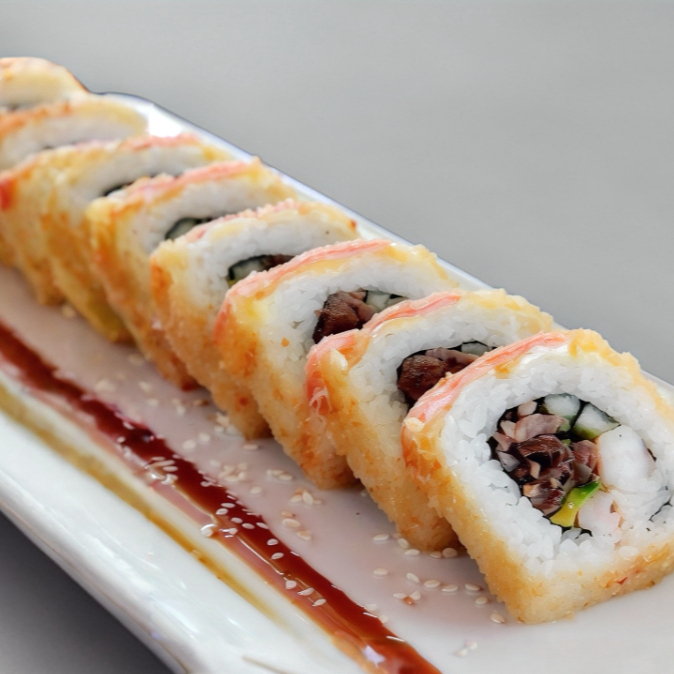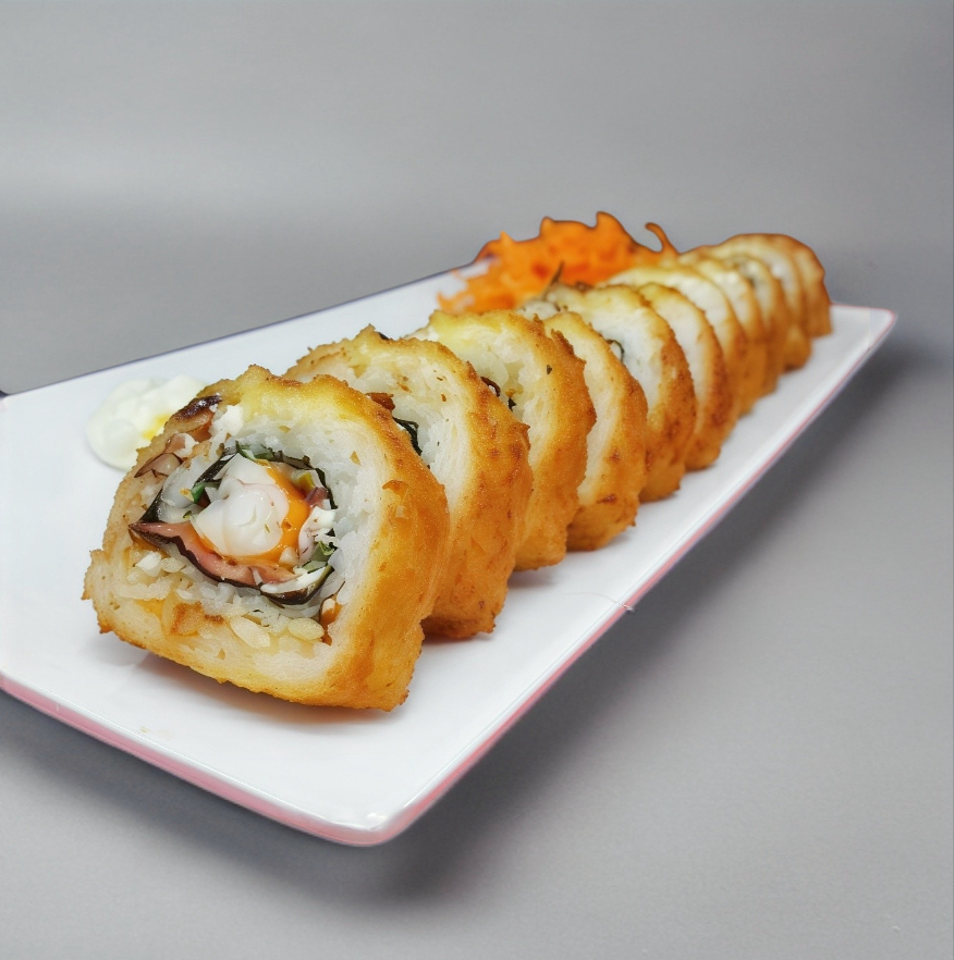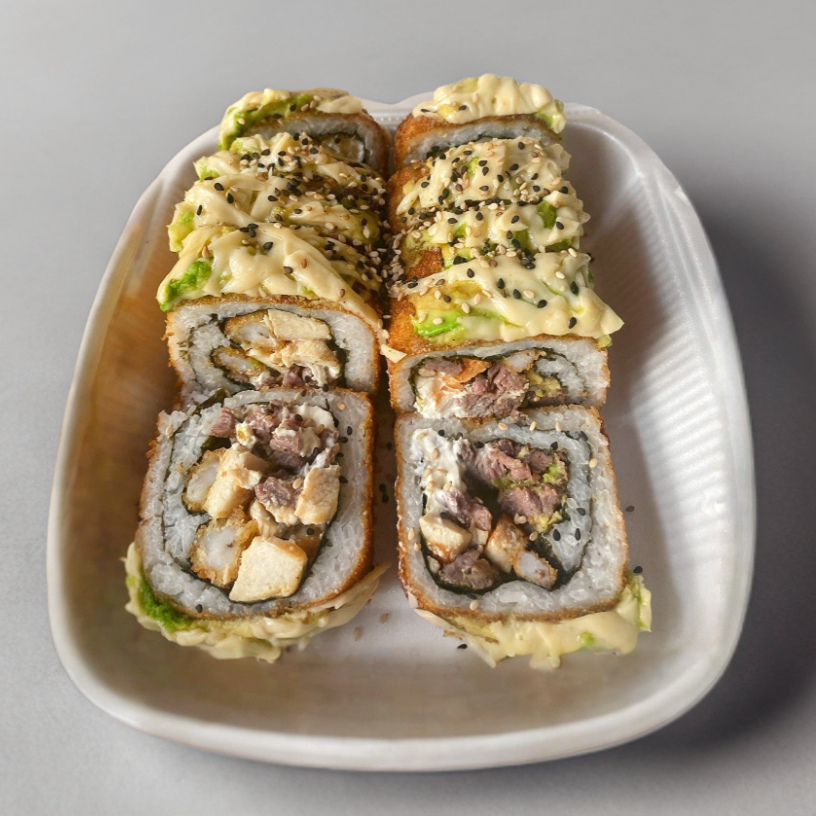 10 piezas: Rollo Empanizado con queso crema, pepino, surimi y aguacate. Coronado con topping de camarón empanizado, tocino y aderezo chipotle.
