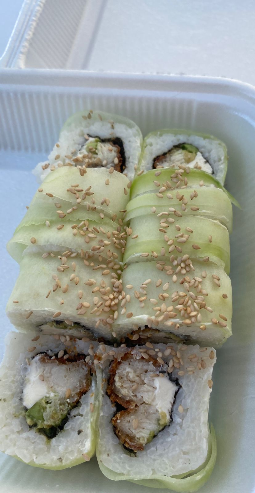 Rollo fresco. Por dentro: queso crema, aguacate y pollo. Cubierto de pepino y ajonjolí.