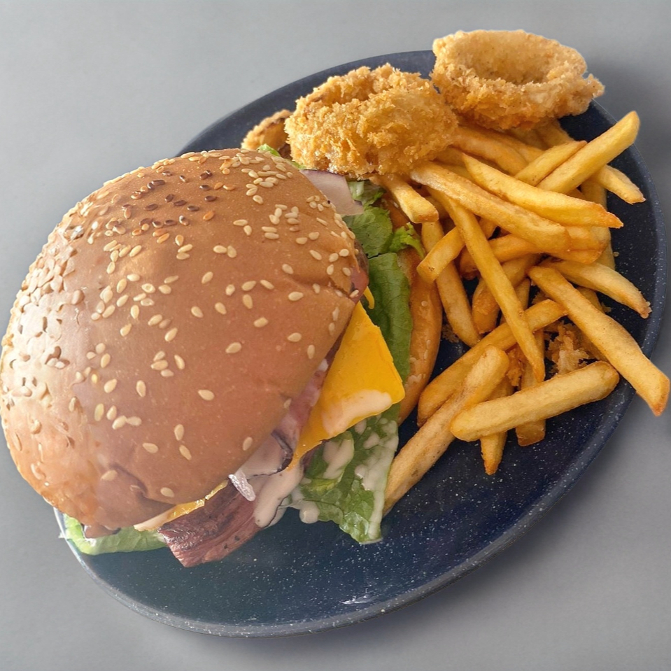 Hamburguesa de res con aros de cebolla, tocino y aguacate. Acompañada de papas a la francesa.