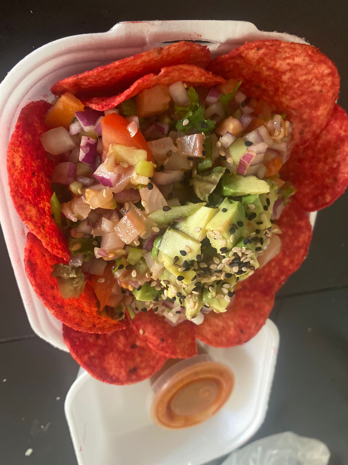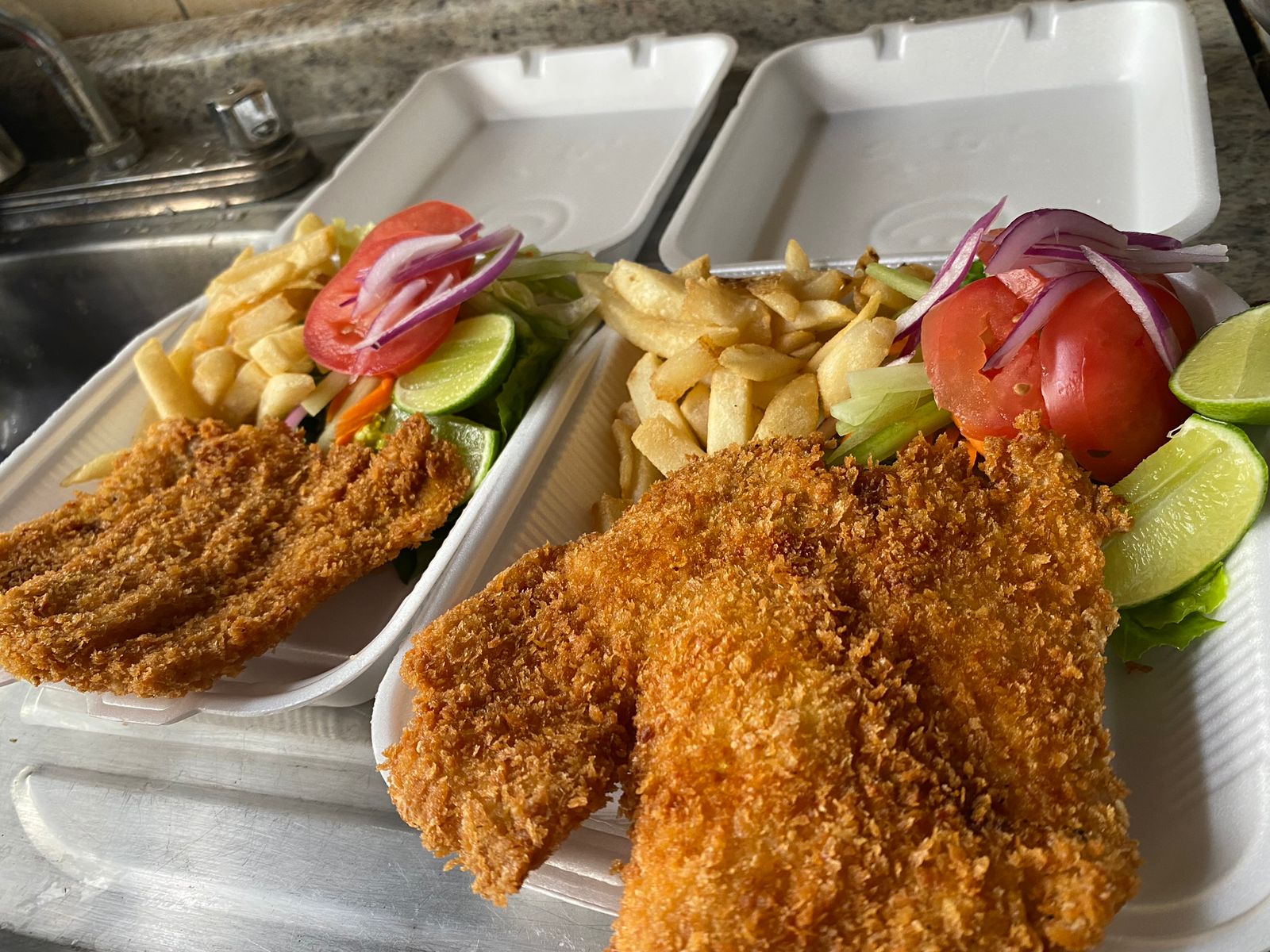 Pescado, mezclado con pico de gallo, marinado con limón y mezcla de salsas.
