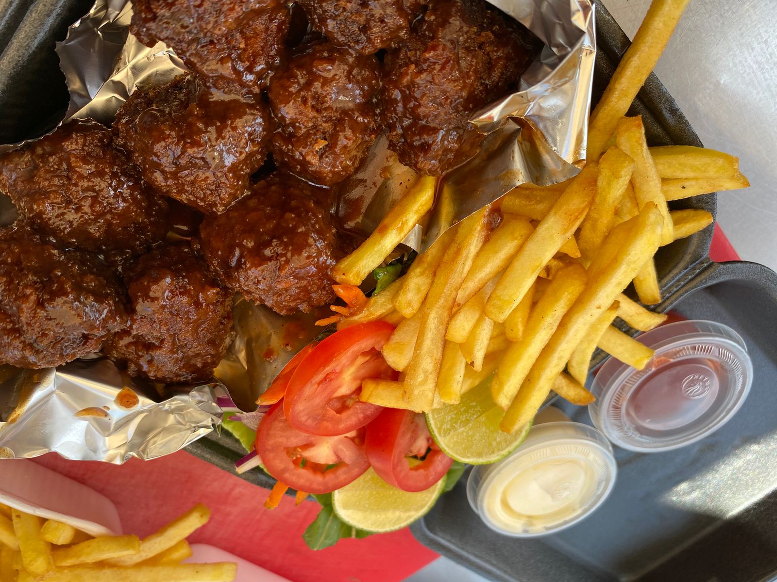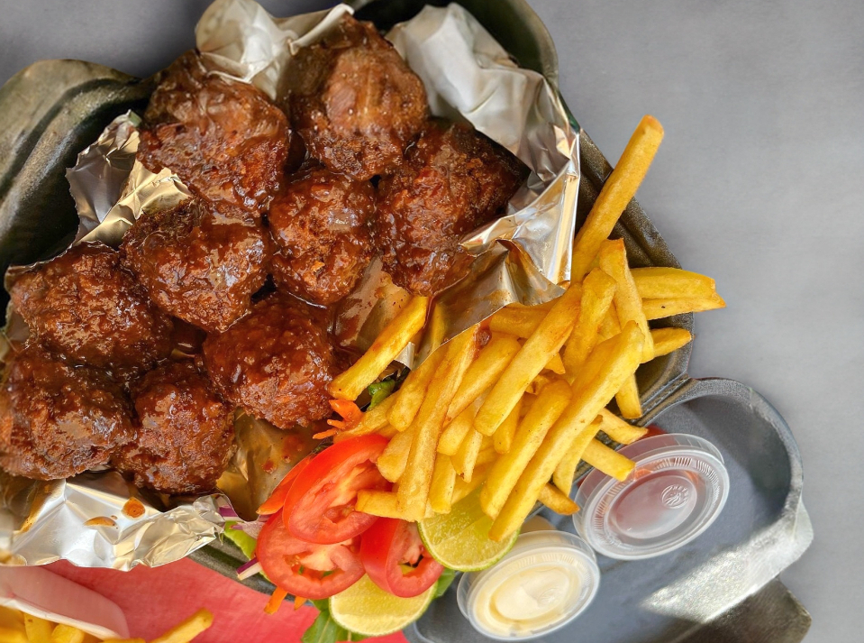 Plato personal con 8 piezas de pechuga de pollo frito bañadas en salsa de tu elección, acompañadas de 100 g de papas a la francesa, con opción a extra de papas y ensalada.