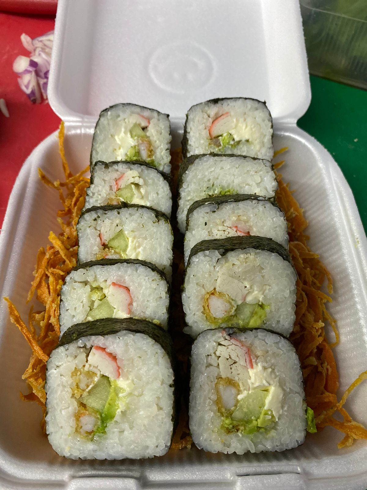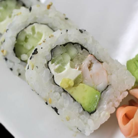 rollo fresco por fuera ajonjoli, por dentro pepino,aguacate y surimi