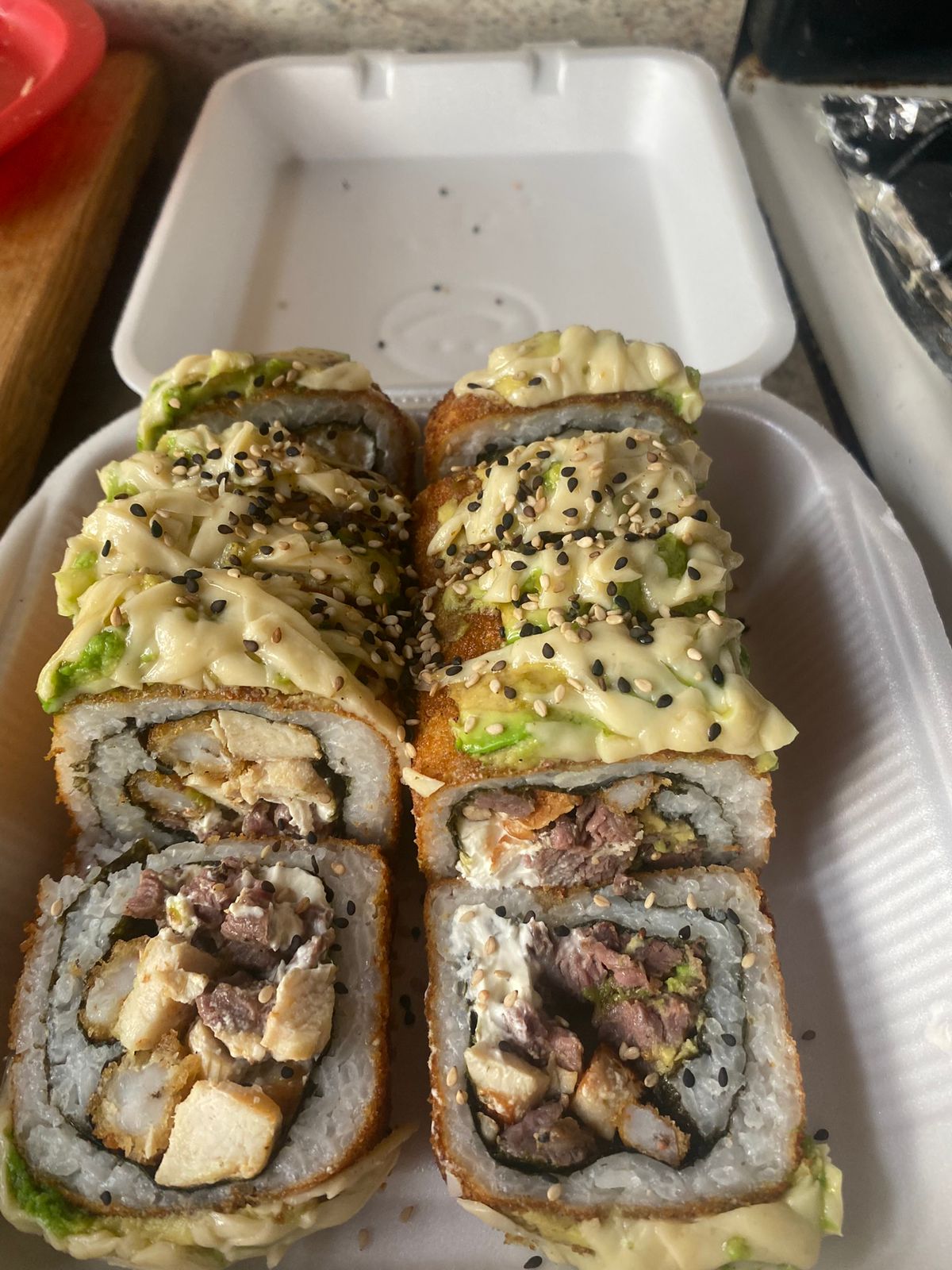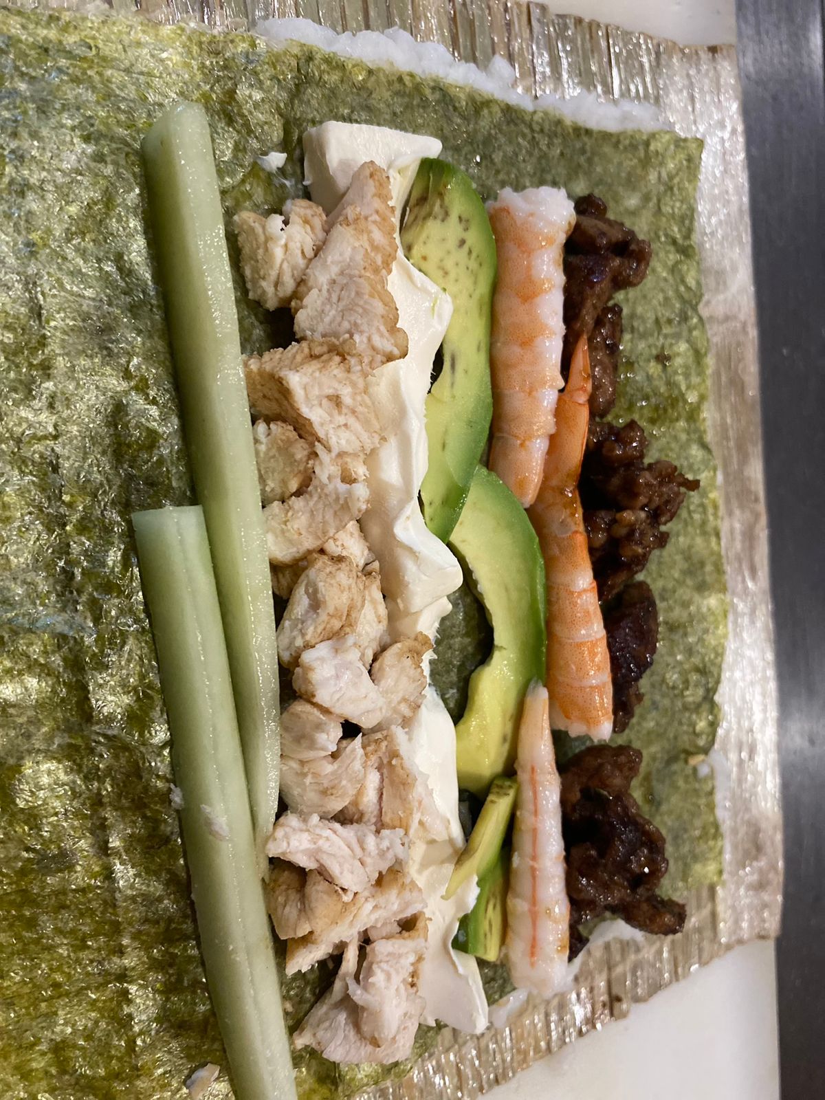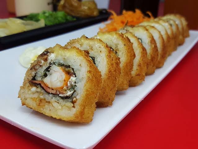 rollo gigante. empanizado por dentro quesocrema, aguacate,pepino,pollo,carne,camaron y surimi