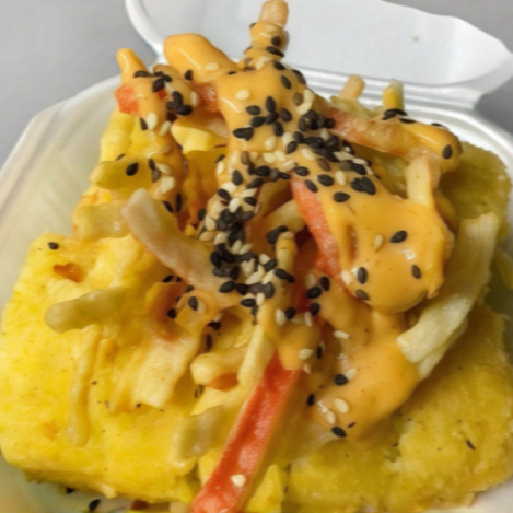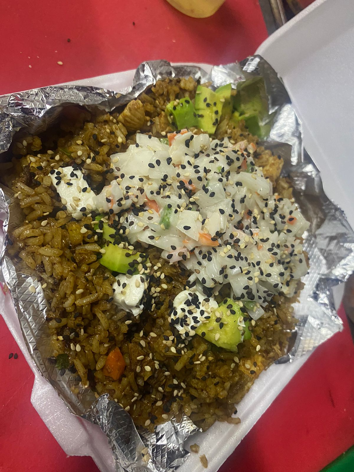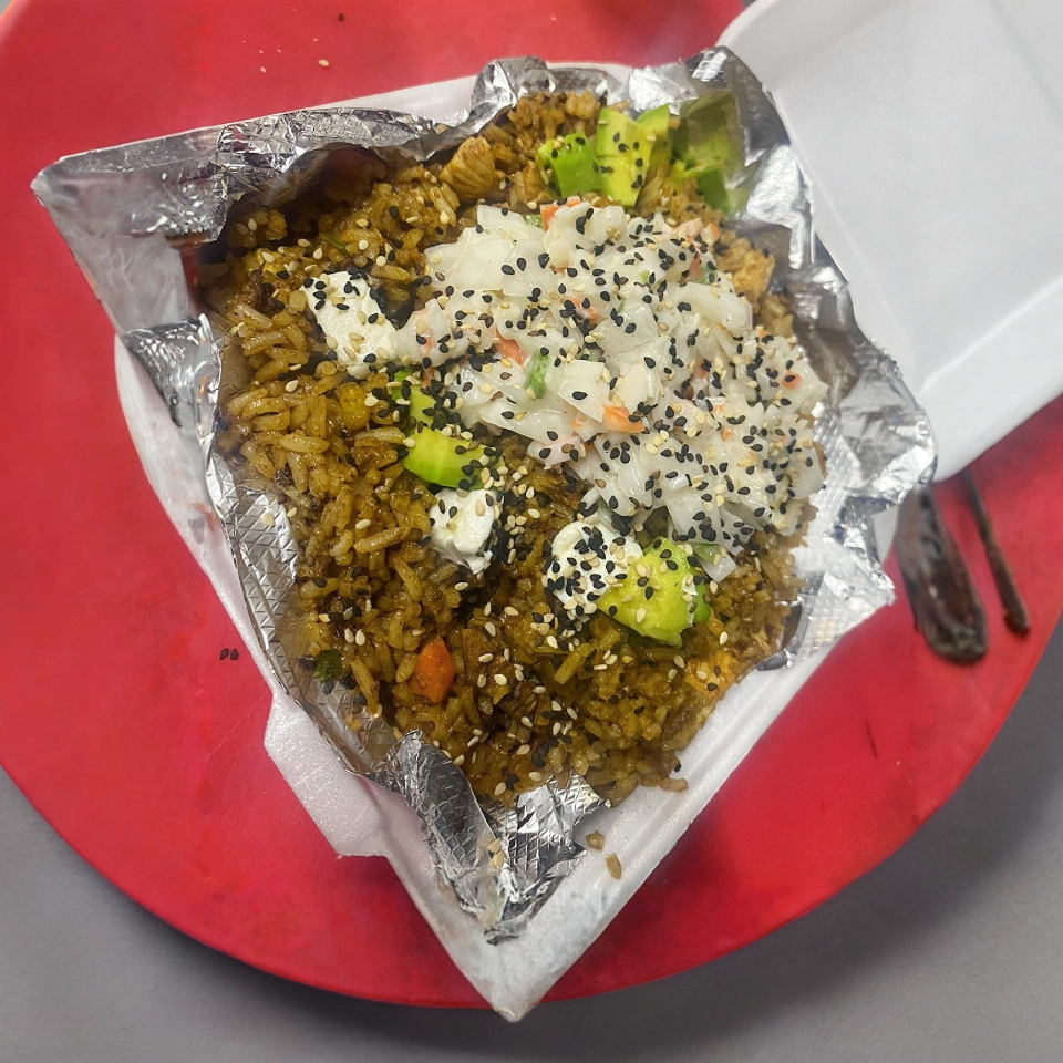 Arroz frito con verdura y 100 gr de proteína a elegir, coronado con aguacate, queso crema y ensalada tampico.