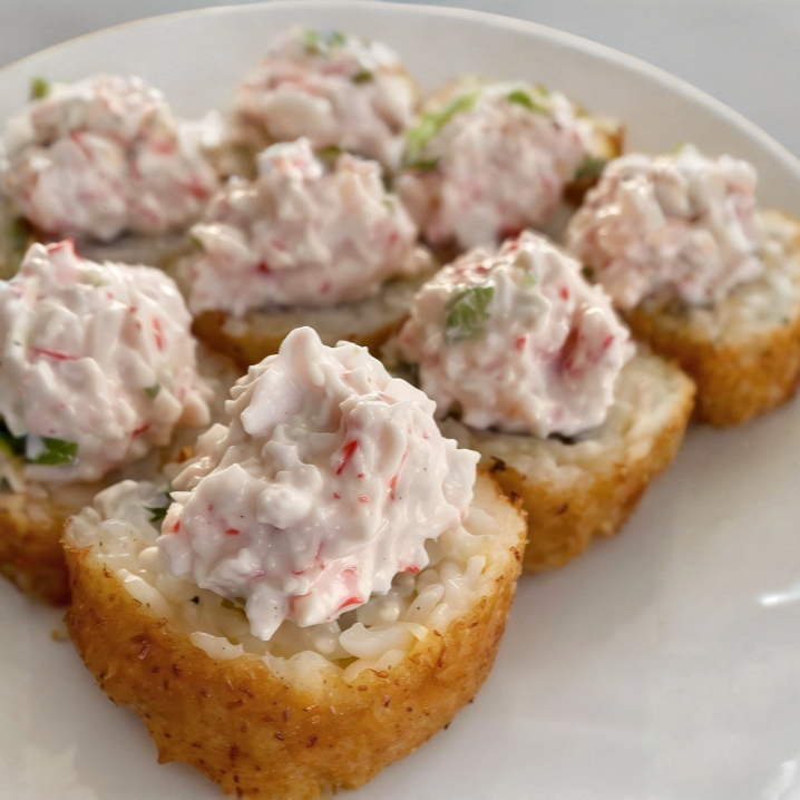 Rollo Empanizado. Por dentro: queso crema, salmón y pepino. Coronado con chicharrón de surimi.