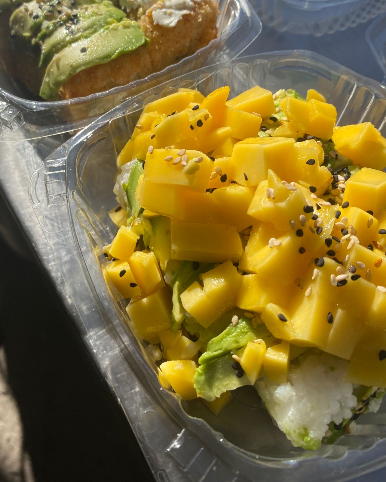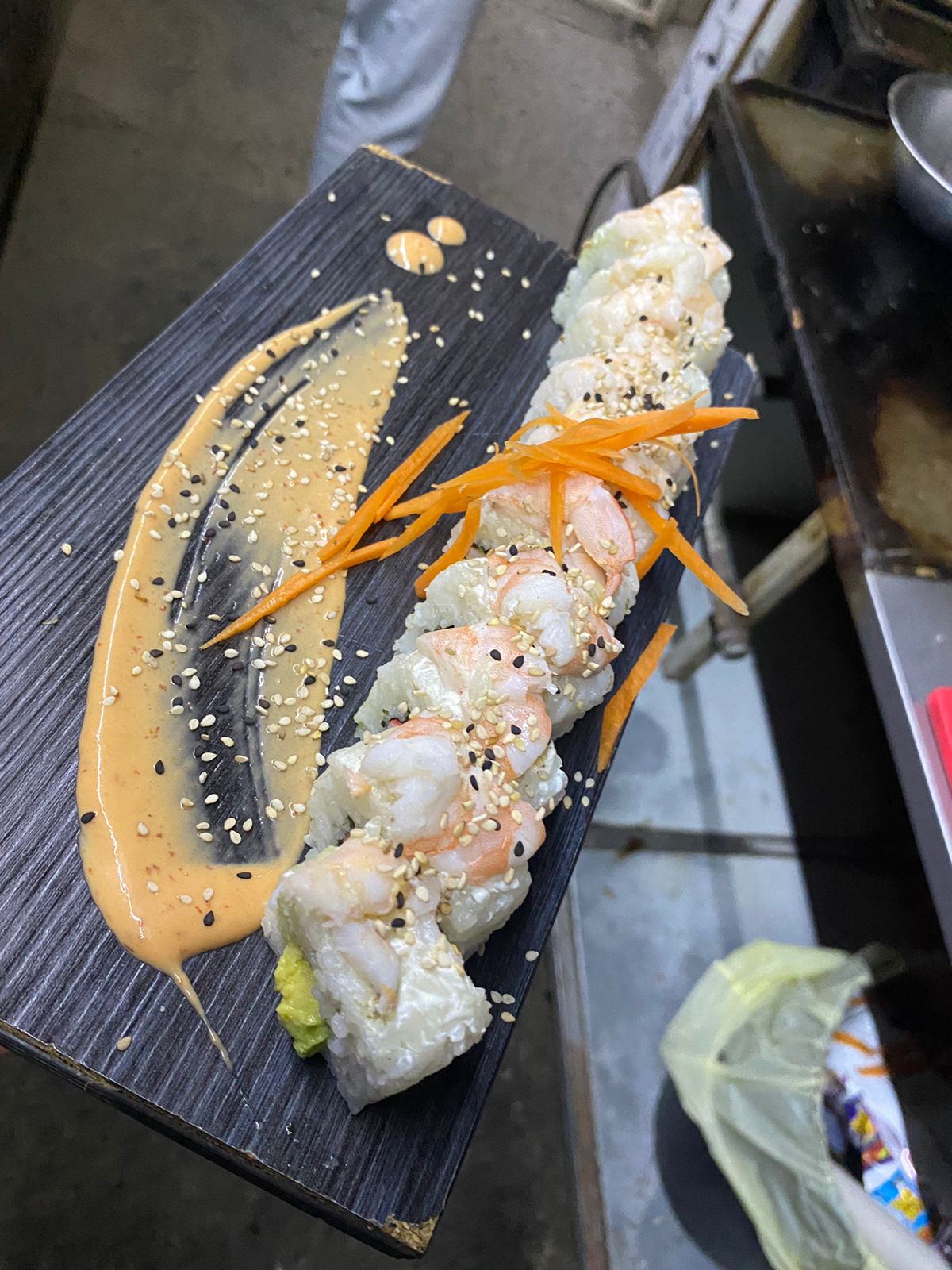 Rollo fresco. Por dentro: camarón, queso crema y aguacate. Cubierto de mango y ajonjolí.
