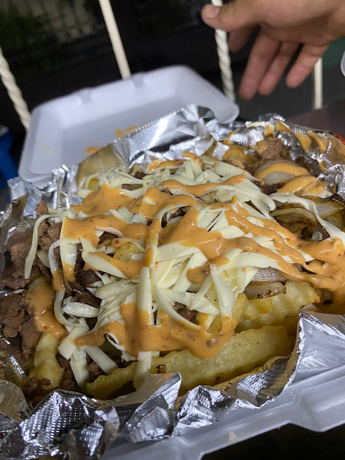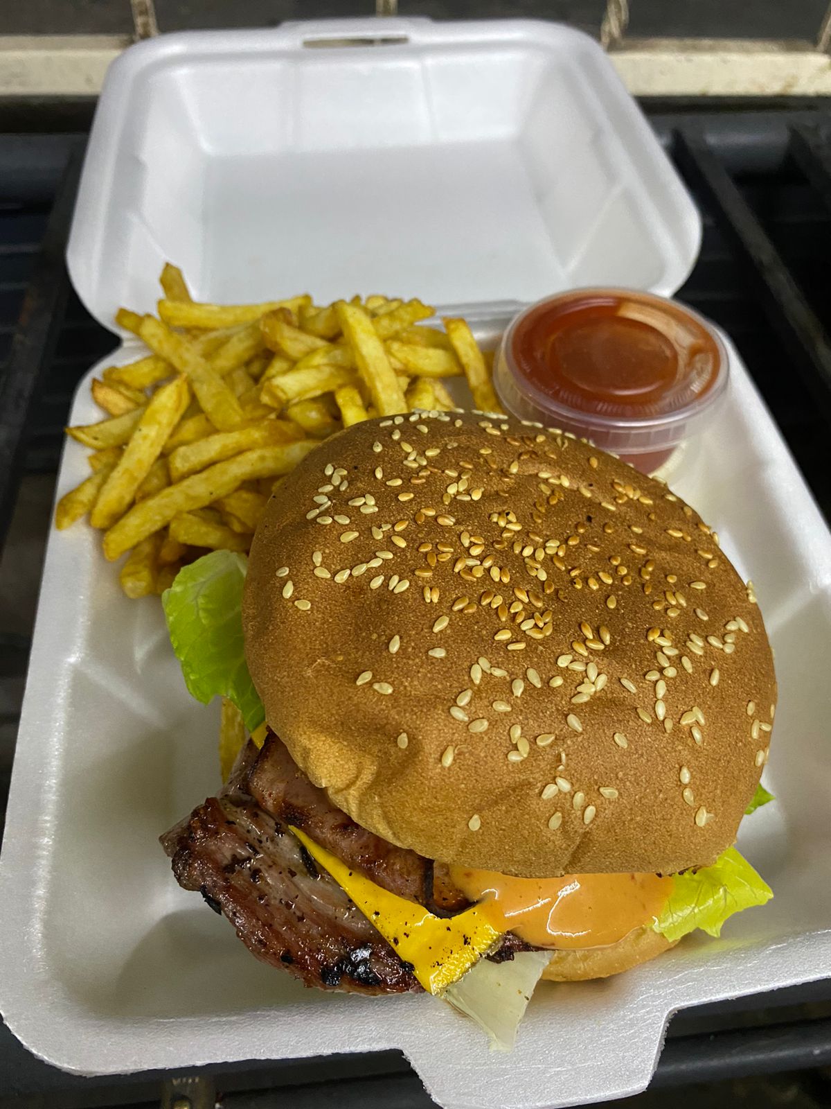 Hamburguesa de arrachera con aguacate y tocino. Acompañada de papas a la francesa.