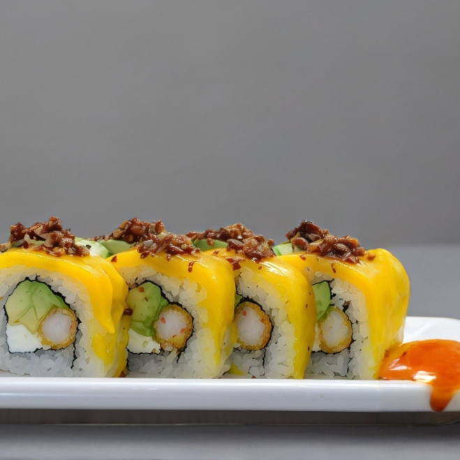 Rollo fresco. Por dentro: queso crema, pepino y camarón empanizado. Cubierto de aguacate y topping de mango.