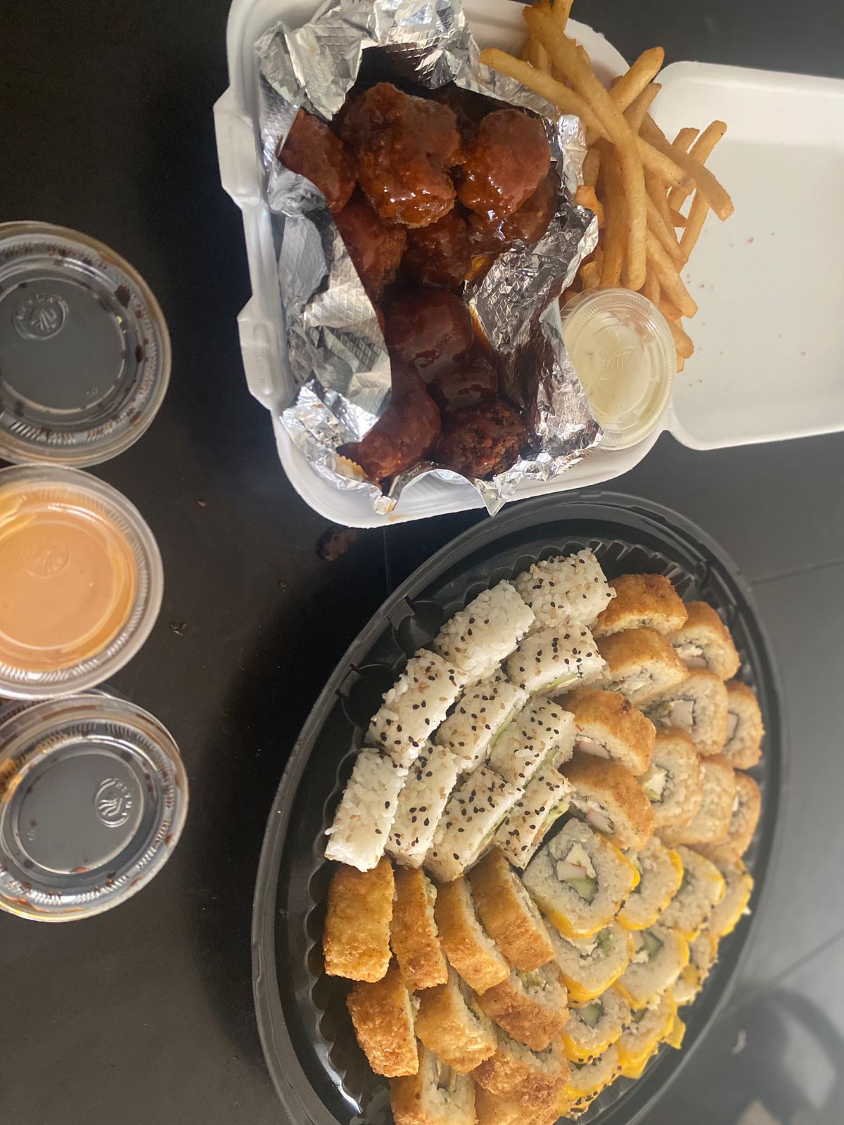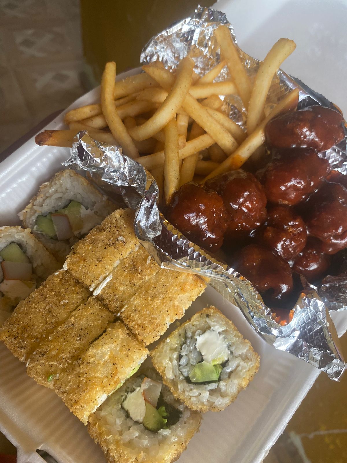 1 rollo kemi roll, 1 rollo naruto roll, 1 rollo california de camaron, 1 asta roll, acompañado de 1 orden de boneless con papas y ensaladas