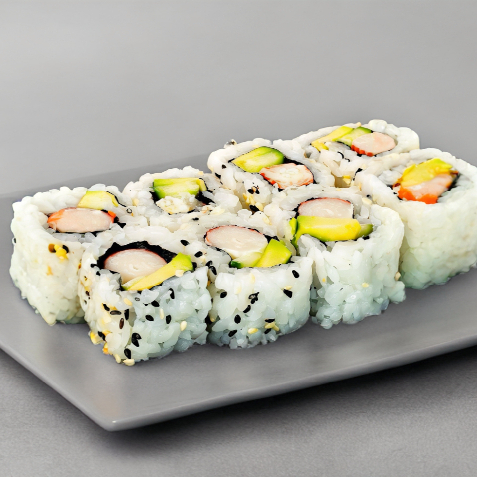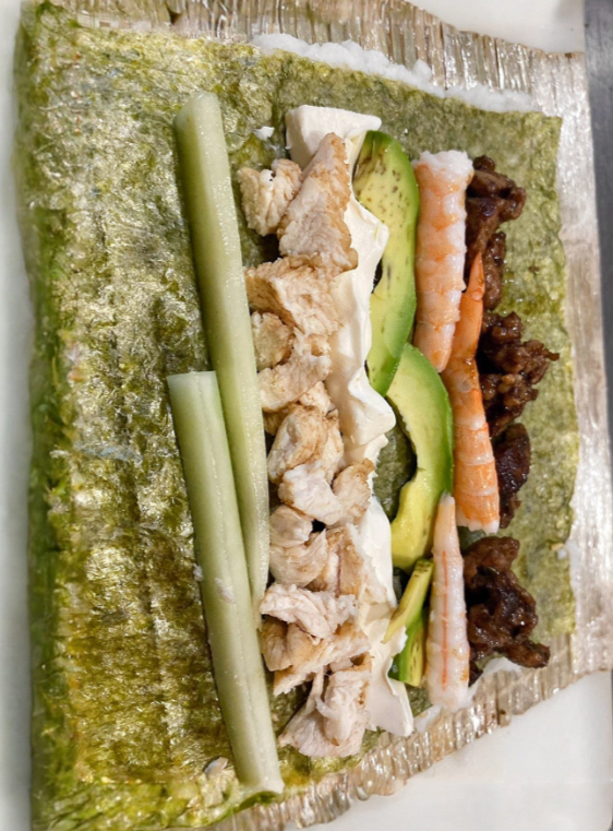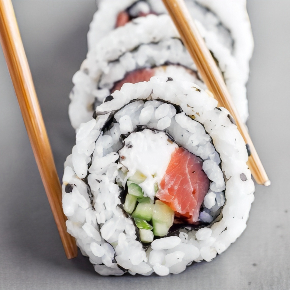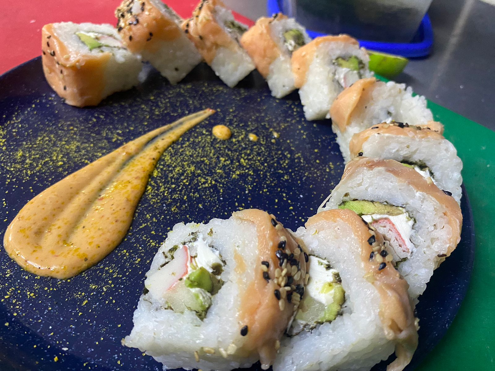 Por dentro: camarón, tampico y pepino. Por fuera cubierto de salmón.