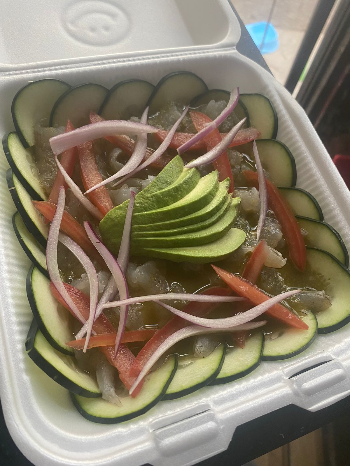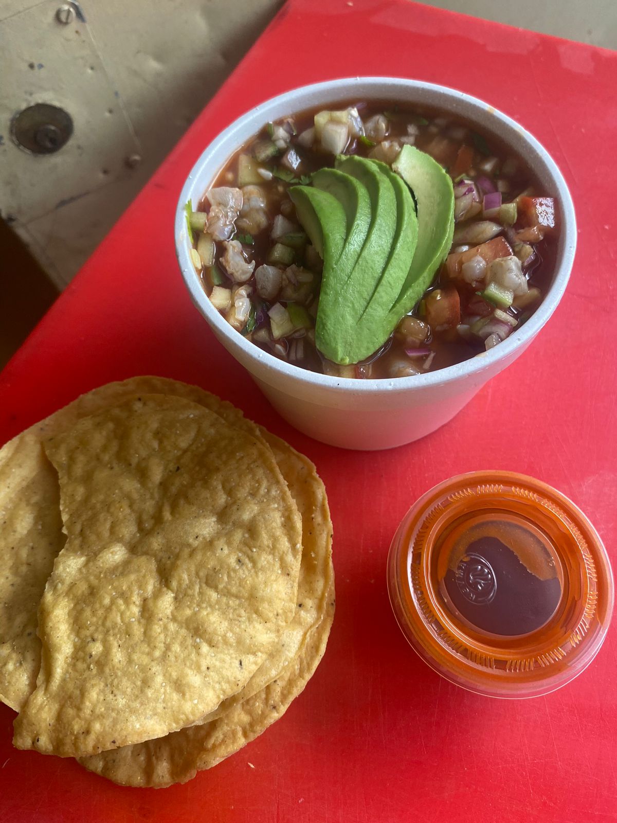 Camarón y pescado mezclados con pico de gallo, marinado con limón y mezcla de salsas.