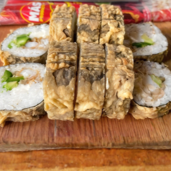Rollo Empanizado. Por dentro: queso crema, carne asada, aguacate y pepino.