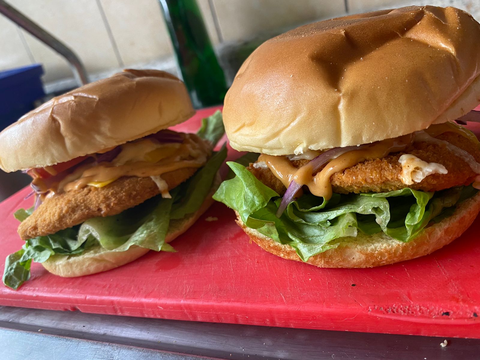Hamburguesa de pollo frito. Acompañada de papas a la francesa.