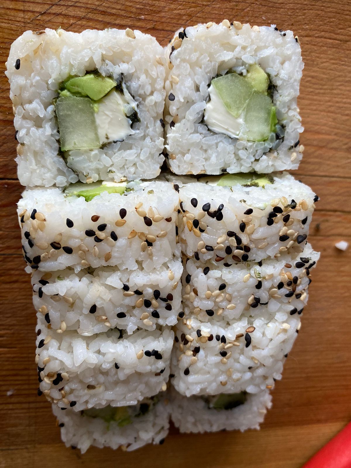 Rollo fresco. Por dentro: queso crema, pepino y aguacate. Por fuera ajonjolí.