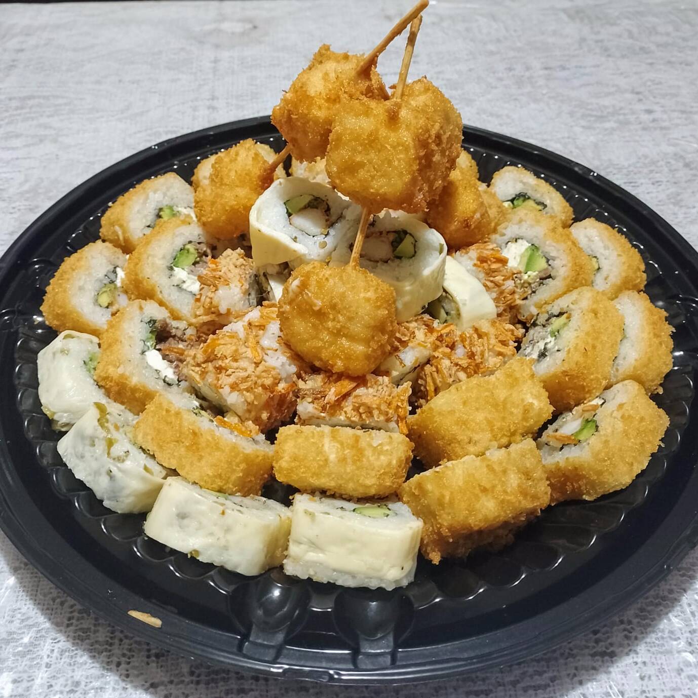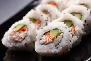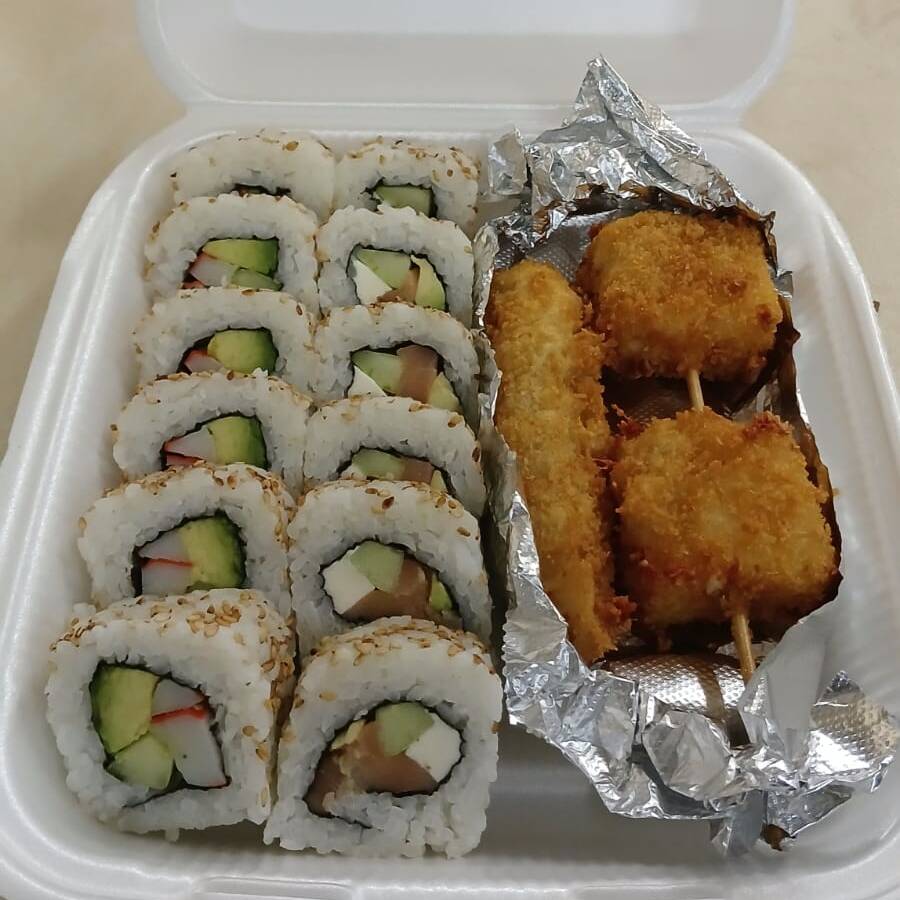 Roll de California de camarón empanizado, roll de California cangrejo, roll de California queso y roll de California simple empanizado. 40 piezas