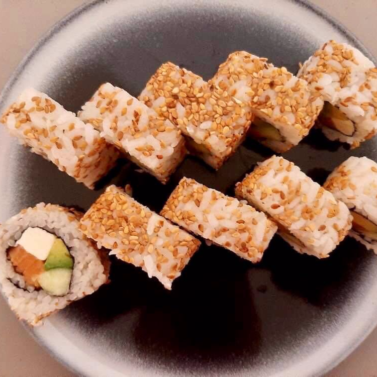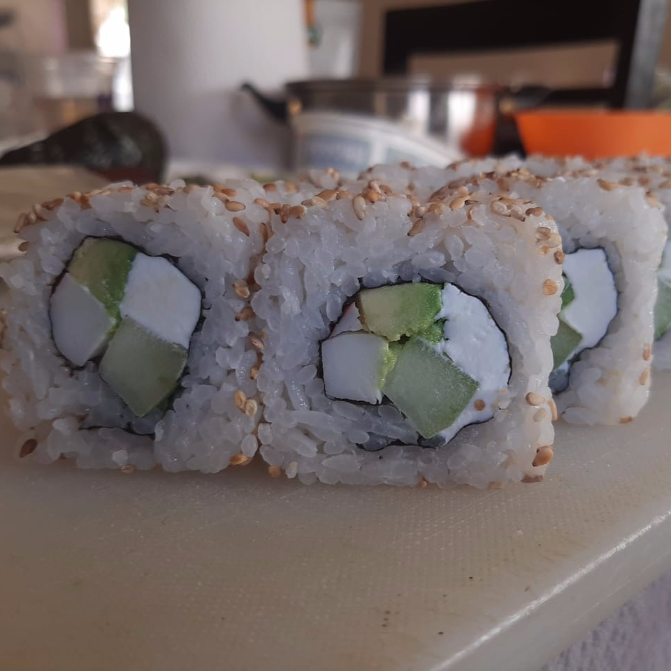 Roll de aguacate, pepino, surimi, cubierto de ajonjolí
