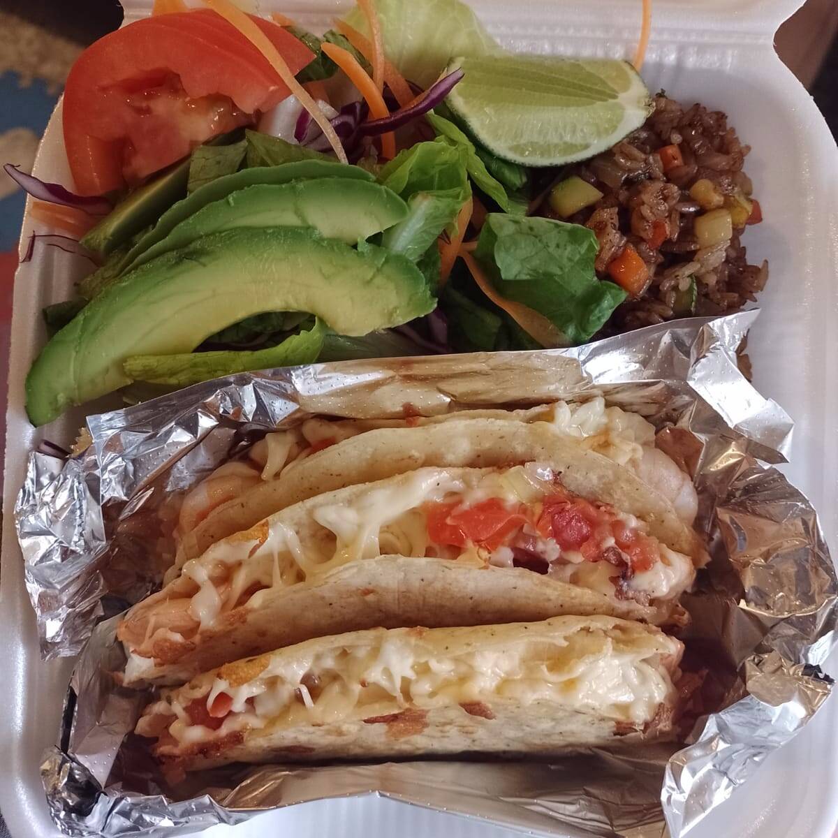 4 piezas de tortillas de maíz, queso manchego, camarones, cebolla y tomate, acompañado de arroz de verduras, ensalada y salsa