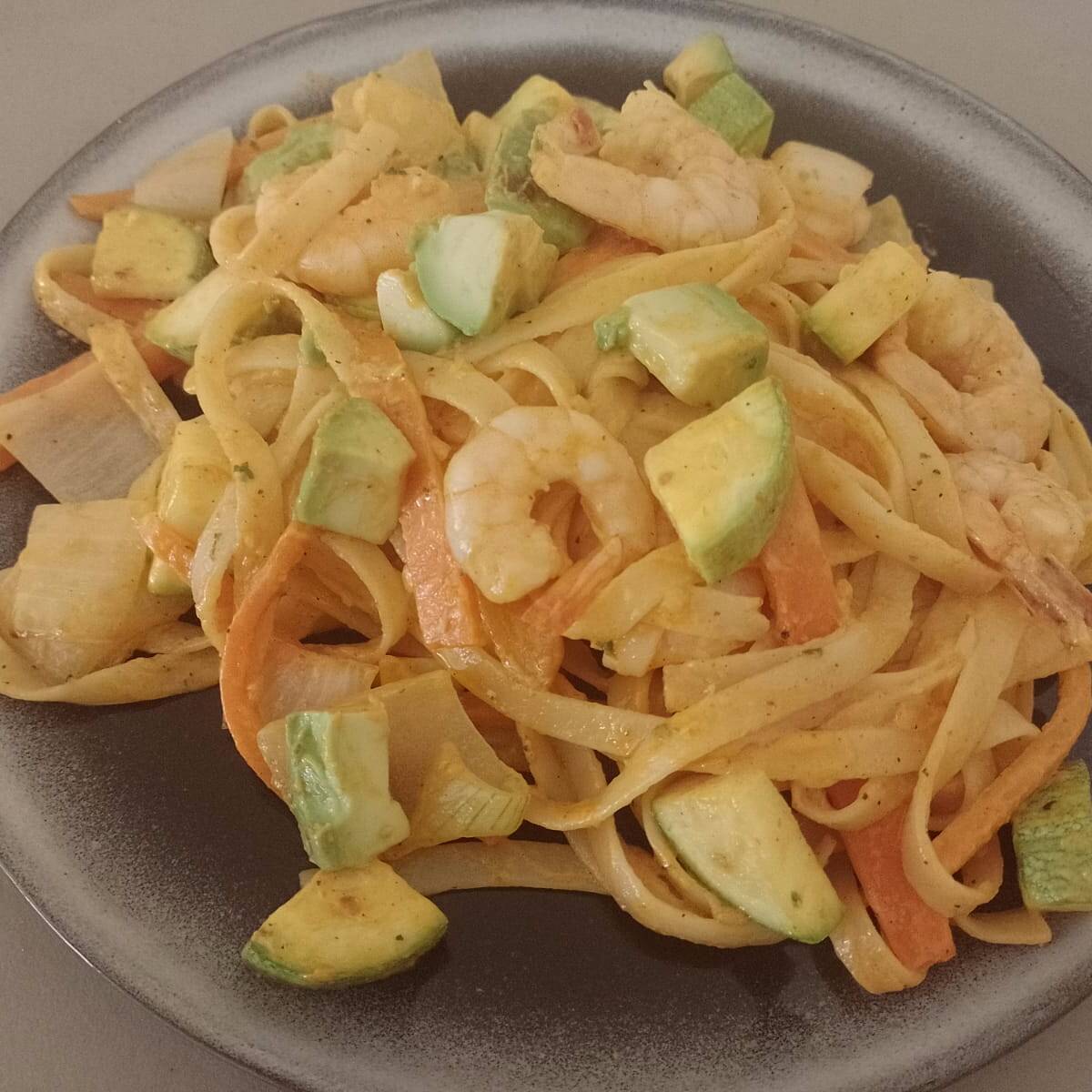 Pasta fetuccini con aguacate, zanahoria, calabaza, cebolla blanca y camarones, mezclada con salsa spicy (mayonesa, crema y chiles)