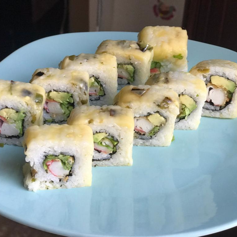 Roll cubierto de queso manchego gratinado con chiles toreados, relleno de cebollín, surimi empanizado y aguacate, acompañado de salsa chipotle