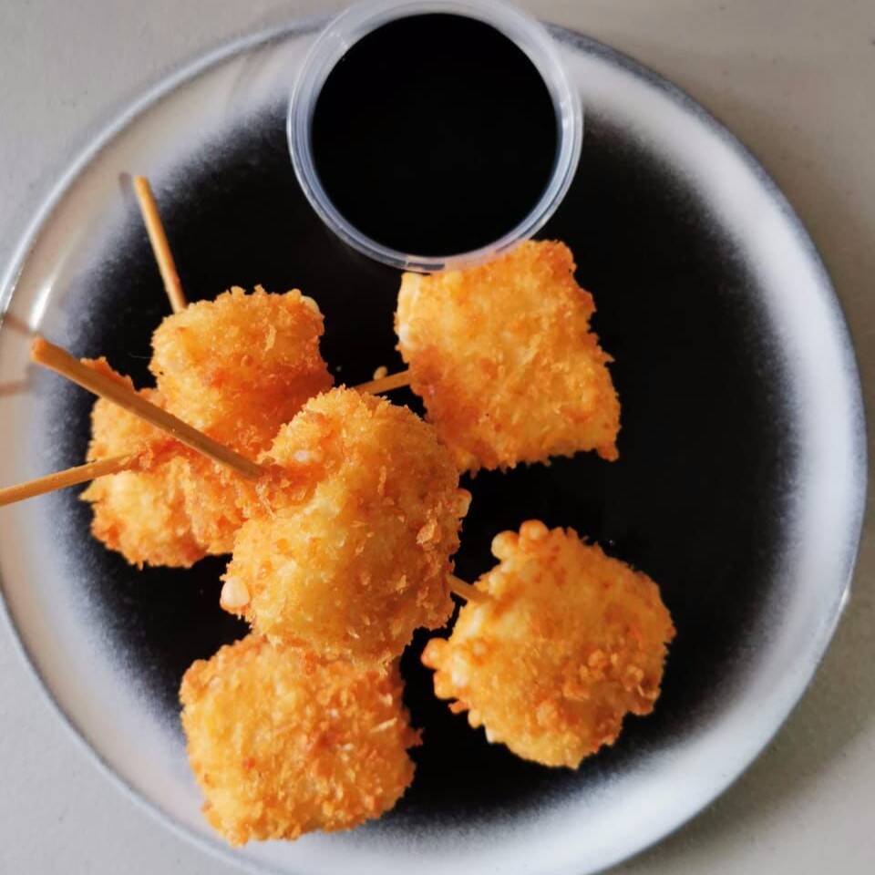 3 brochetas de queso empanizado, acompañadas de salsa Kushiague
