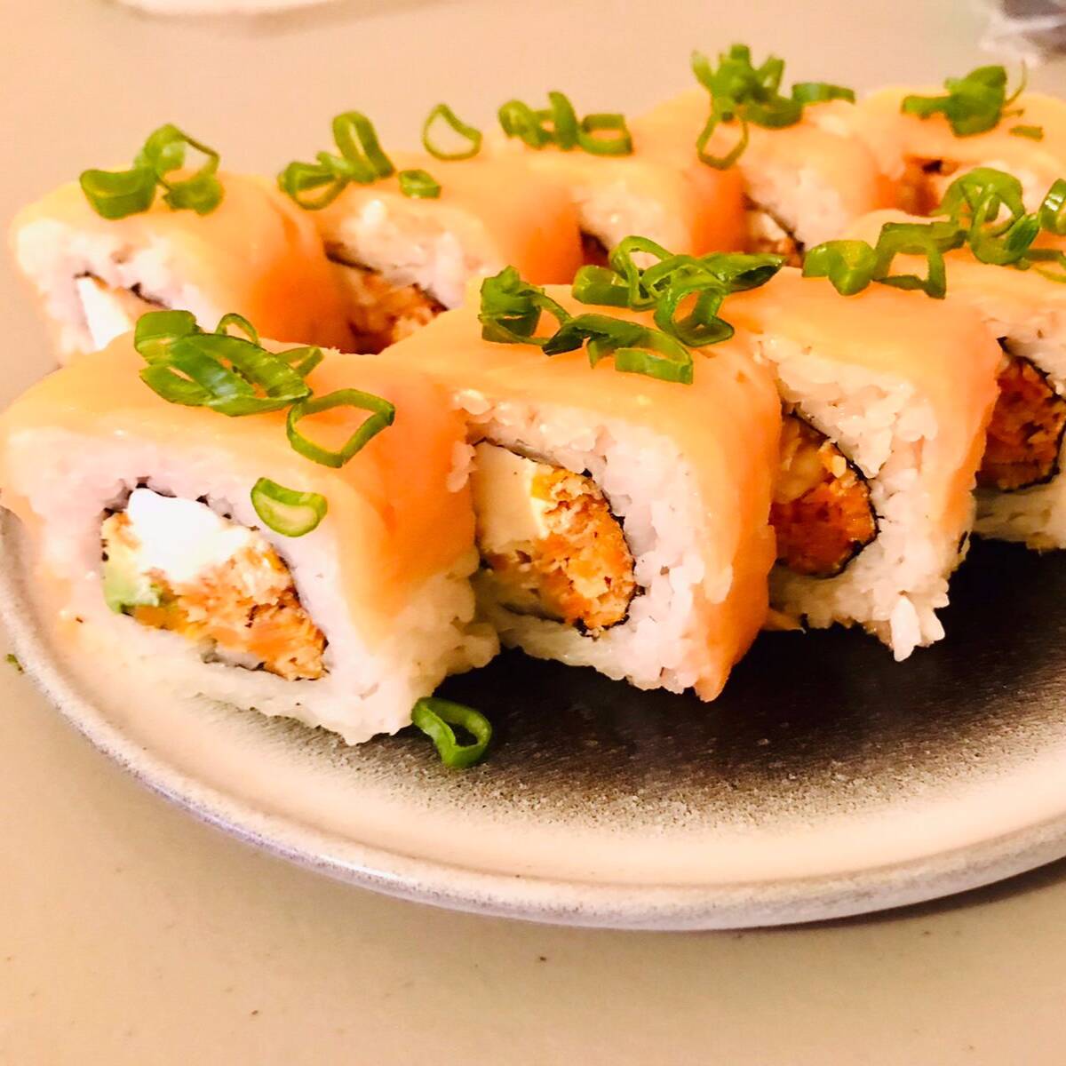 Roll cubierto de salmón fresco y encima cebollín, relleno de queso crema, kakiague y aguacate, acompañado de salsa chipotle