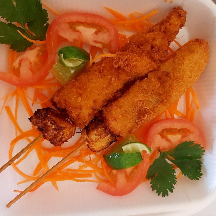 4 brochetas de pollo empanizado y piña asada, acompañadas de salsa dulce